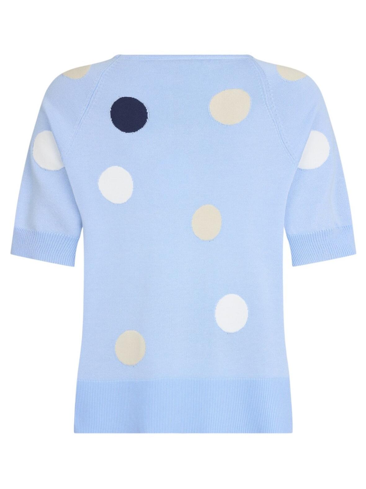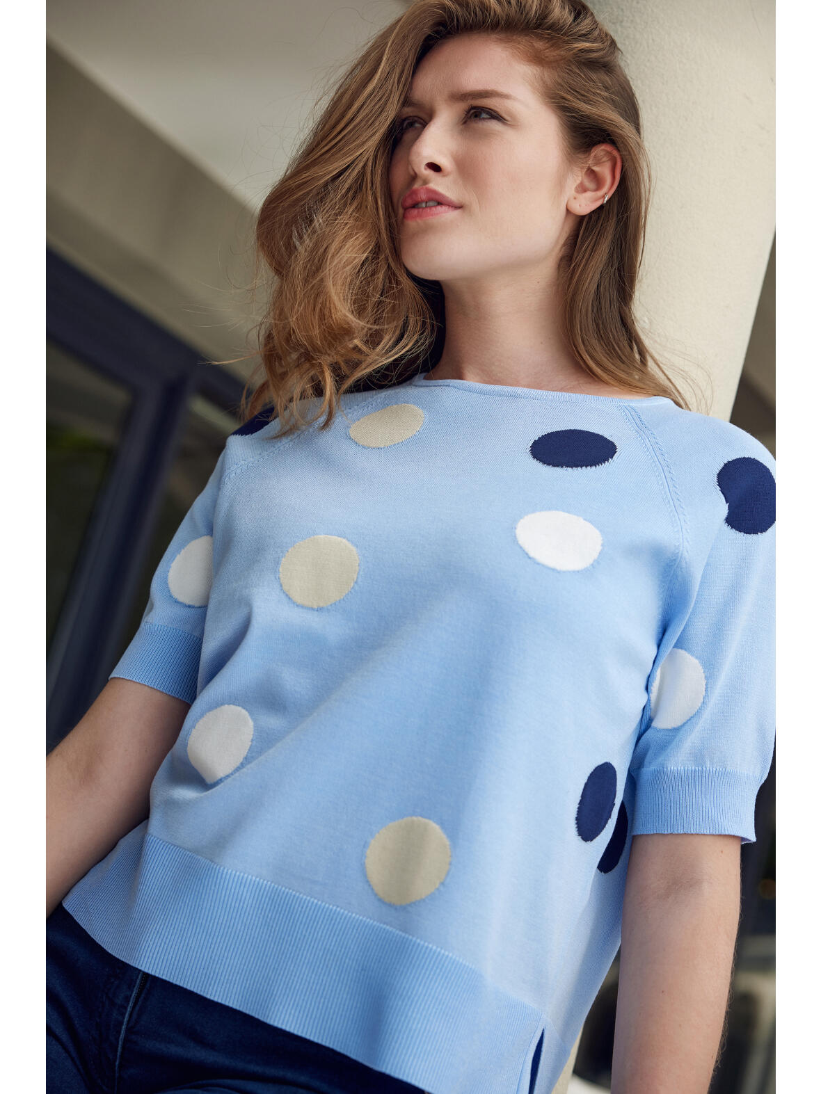 Designet har korte raglanærmer med ribkant, ribkant forneden og slids i begge sider. Store bomber i marineblå, offwhite og lyseblå giver et grafisk, blødt mønster. Stoffet føles let og falder blødt (75 % viscose, 25 % polyester), og pasformen er almindelig med et let afslappet snit, velegnet til både hverdagsbrug og mere feminine lag-på-lag looks.