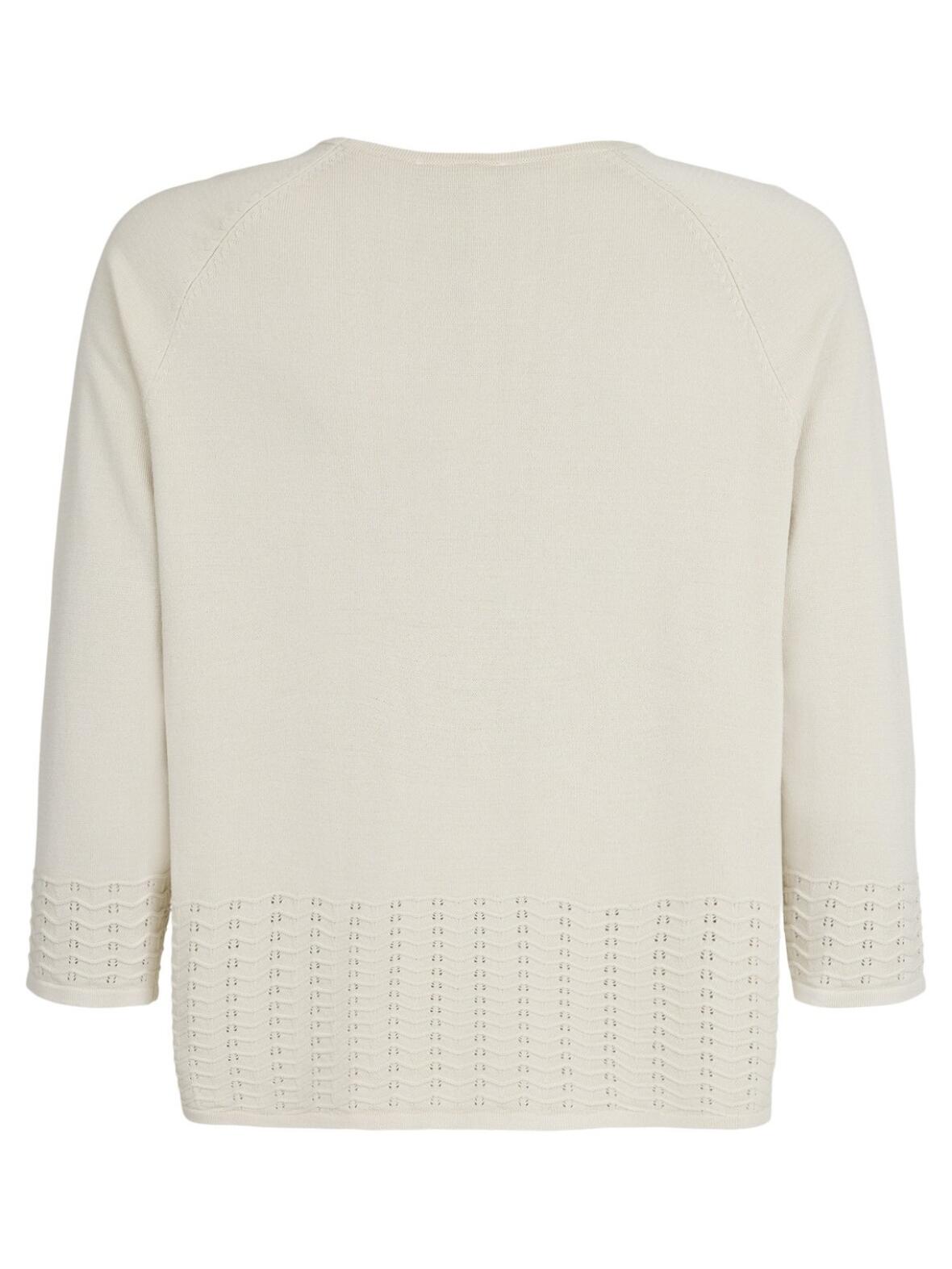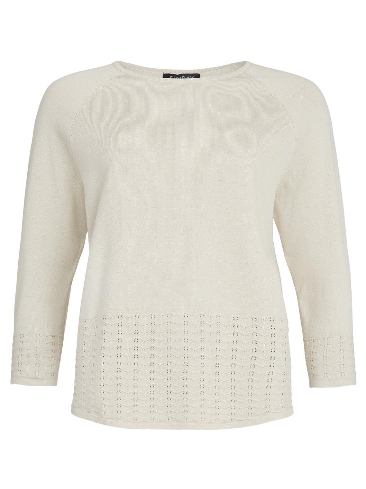 - Detaljer: Rund hals, trekvart raglanærmer, bredt hulmønster og bølgekant, let afrundet forneden