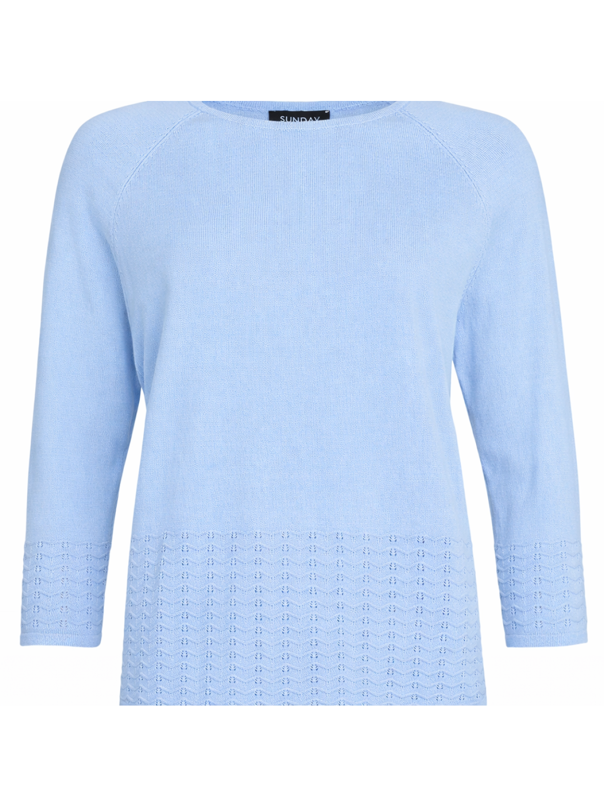 Lyseblå Sunday strik. En blød og feminin bluse med rund hals, der giver et roligt og let udtryk.