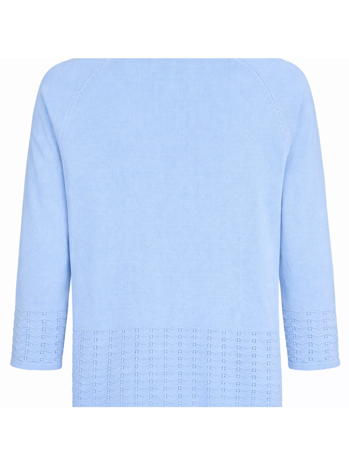 Strikken har trekvart raglanærmer og en dekorativ bred hulmønsterkant forneden og nederst på ærmet samt en bølgekant, der giver delikate detaljer. Stoffet føles blødt mod huden og falder let, takket være blandingen af viscose og elastan. Blusen er let afrundet forneden og passer til både afslappede og mere polerede outfits.