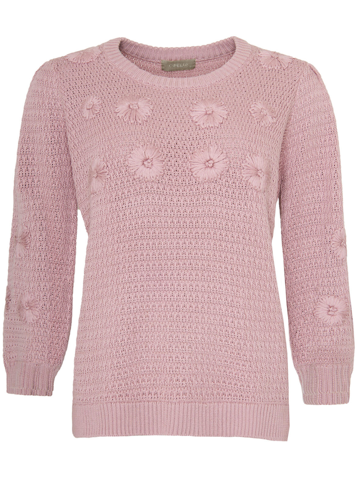 Strik fra Ofelia i støvet rosa. Nori strik bluse med rund hals og trekvart ærmer, designet til at give et blødt, feminint udtryk.