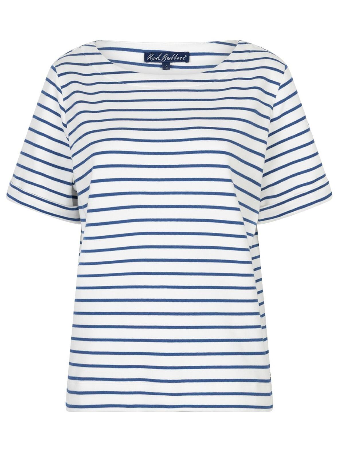 Red Button Terry kort ærmet sweat t-shirt i hvid og jeans blå stribet med en behagelig bomuldsblanding. Designet er enkelt med korte ærmer og let struktur i sweat-stoffet, hvilket giver en afslappet, men velafbalanceret silhuet. Materialet føles blødt mod huden og giver et roligt, hverdagsvenligt look, som fungerer både alene og lag-på-lag.