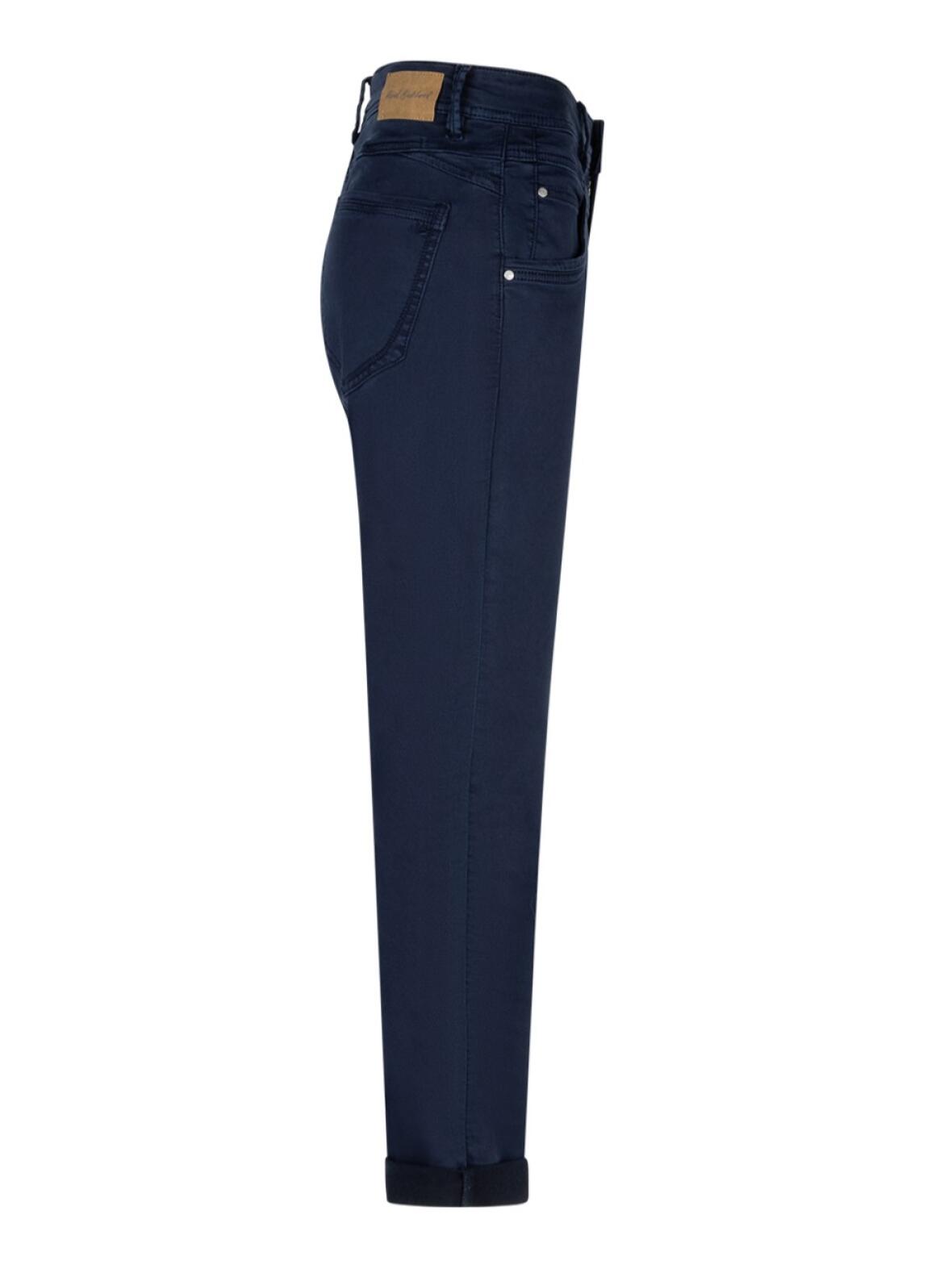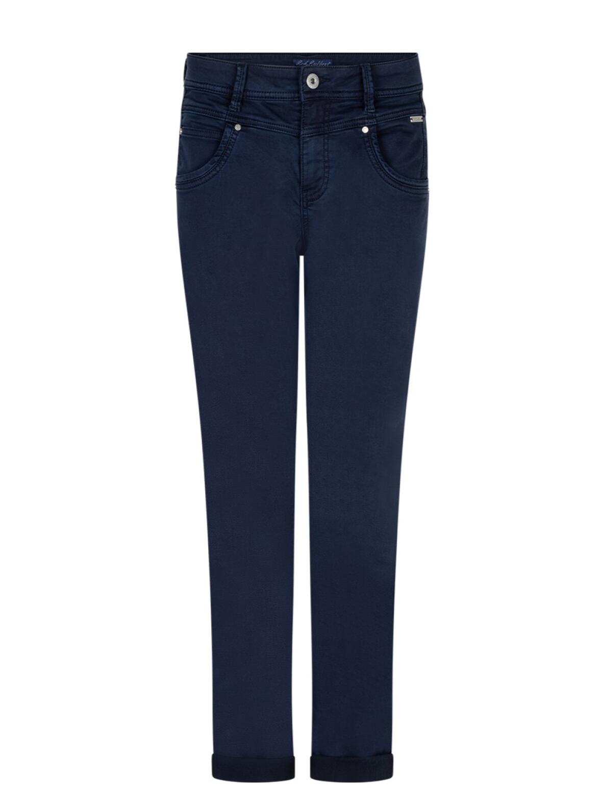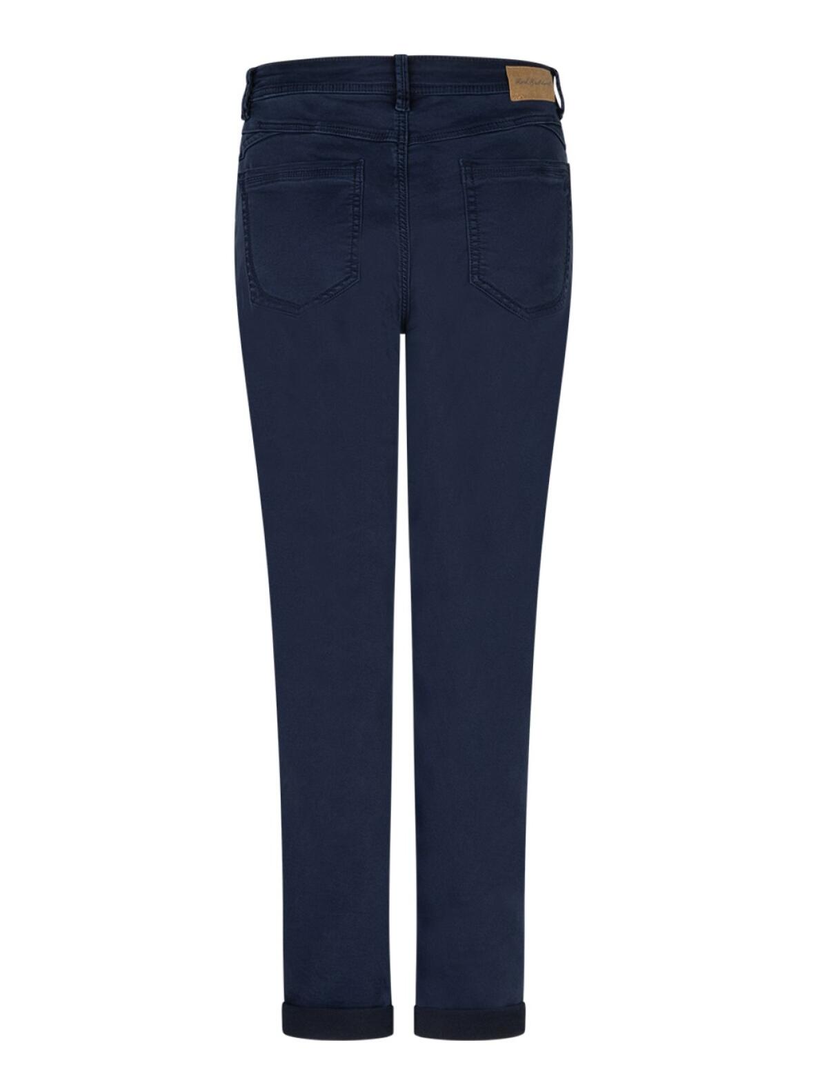 Marine blå jog twill med fem lommer og moderat smalle ben, der skaber en harmonisk silhuet. Regulær facon giver god bevægelsesfrihed, mens stoffets sammensætning på 77 % bomuld, 22 % polyester og 1 % elastan sikrer blødhed og let stretch. Helhedsindtrykket er feminint og afdæmpet, velegnet til både hverdagsbrug og mere festlige outfits.