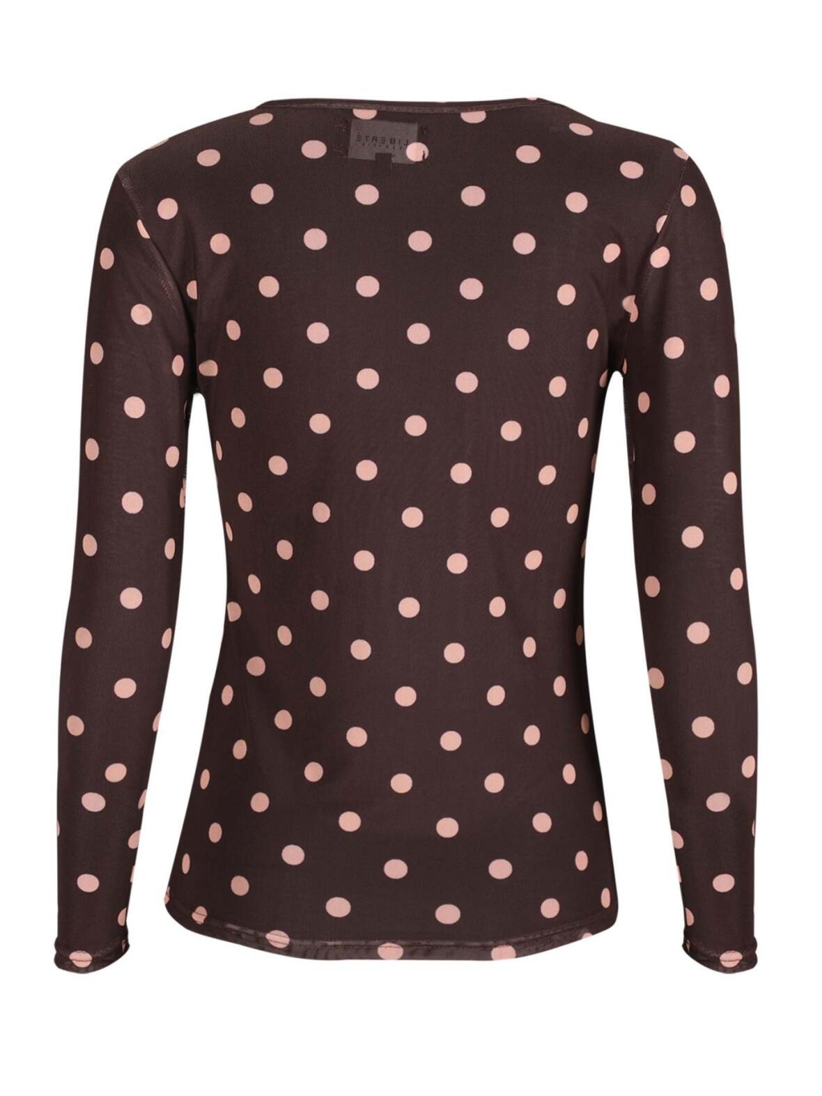 Mesh bluse fra Libertè Essentiel i aubergine. En ny, feminin bluse med fine rosa bomber og en rund hals, der skaber et roligt og sofistikeret indtryk.