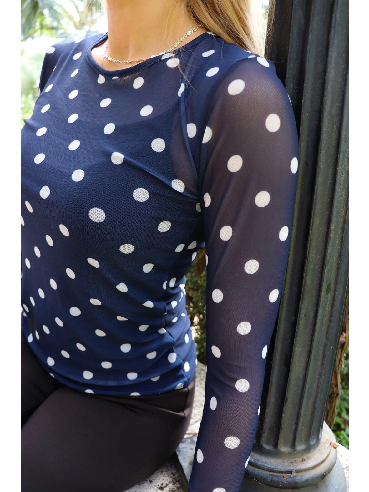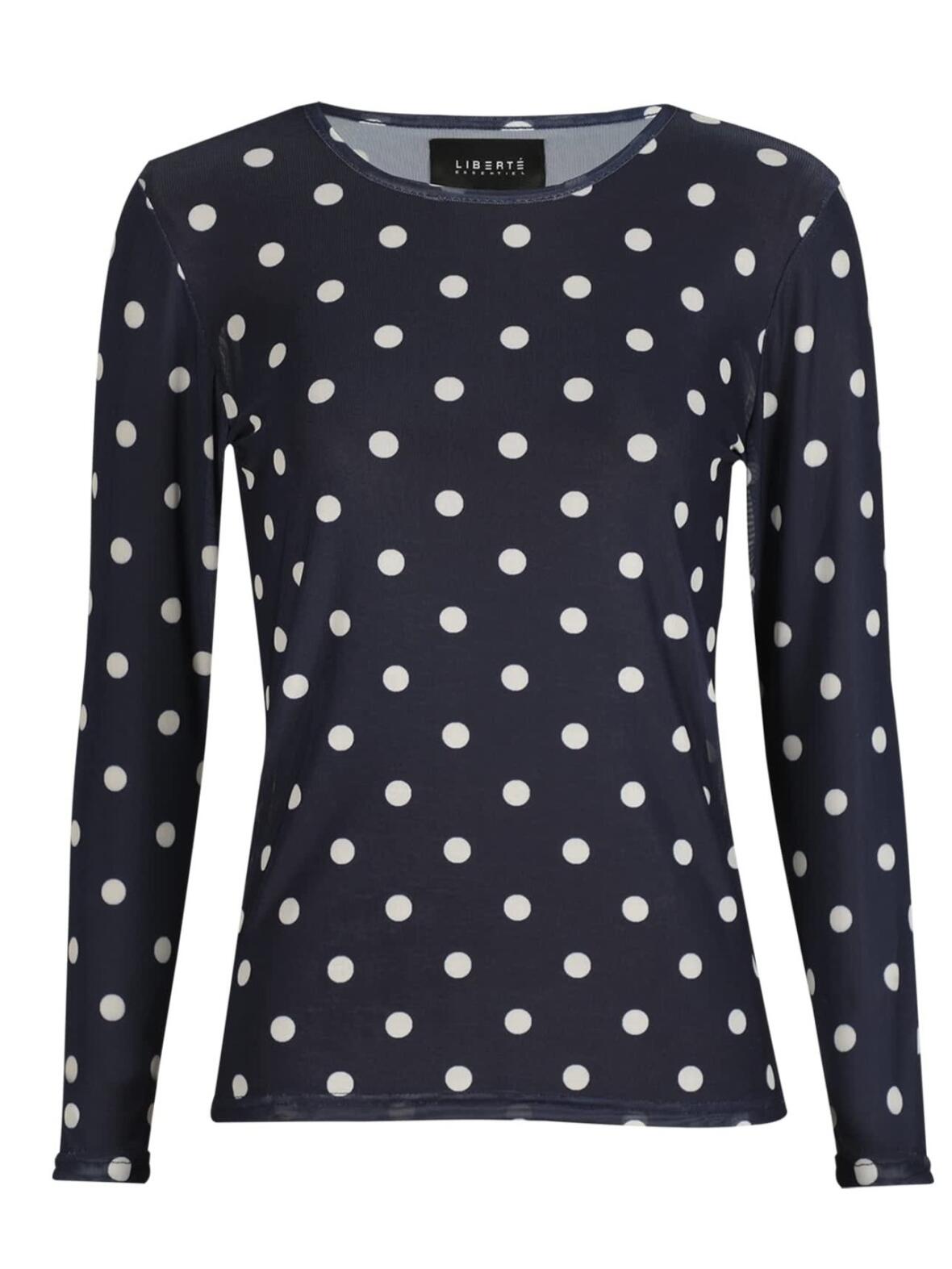 Bluse fra Libertè Essentiel i en rolig marineblå tone med lyseblå bomber. En let og feminin meshbluse, der føles blød mod huden og passer til både hverdag og mere pyntede anledninger.