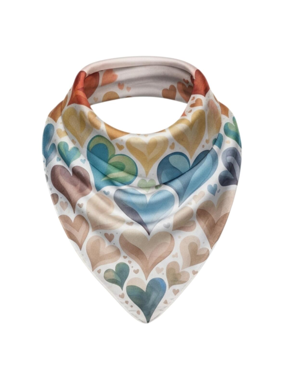 Tørklæde fra Vanting i beige. Et firkantet tørklæde på 70 x 70 cm med et diskret hjertemotiv i blå, lyseblå, brun og offwhite, der tilføjer et blidt farvespil til den varme beige bund.