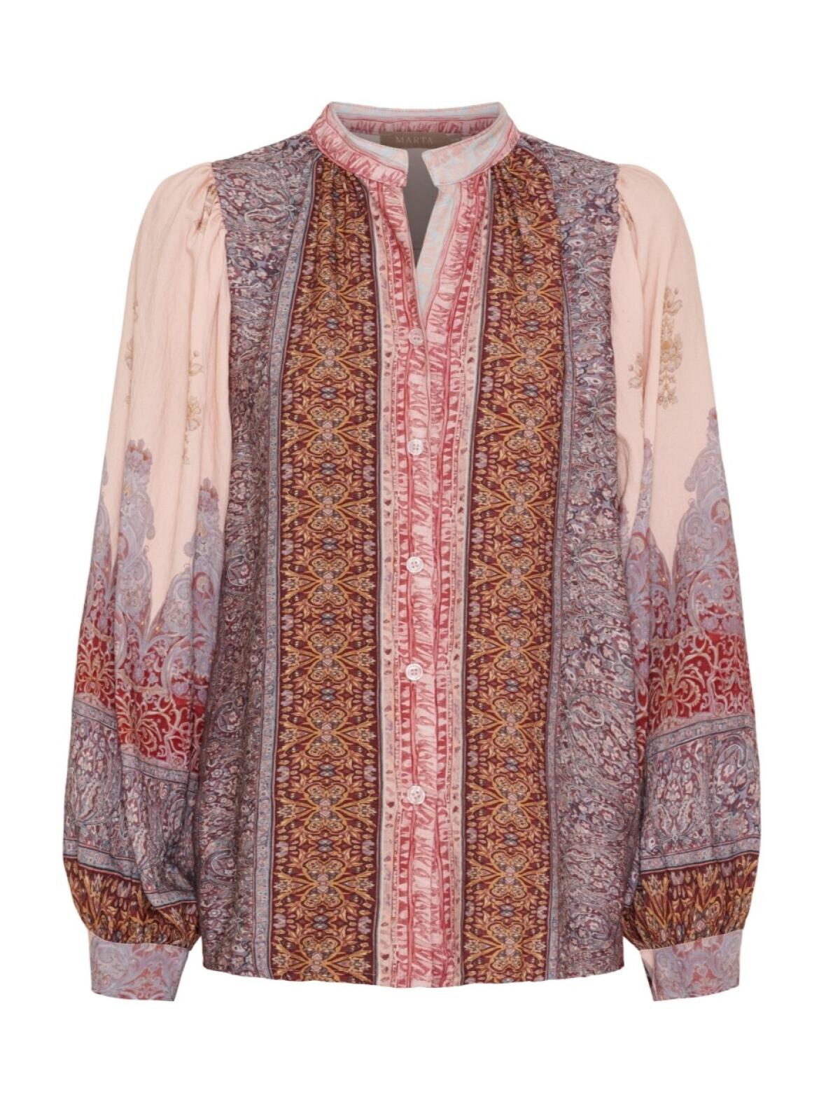 Skjorte/bluse fra Marta Du Château i rosa. Annette-modellen er dekoreret med et blødt pasley-print i rosa og blå-lilla nuancer, der skaber et feminint og roligt udtryk.
