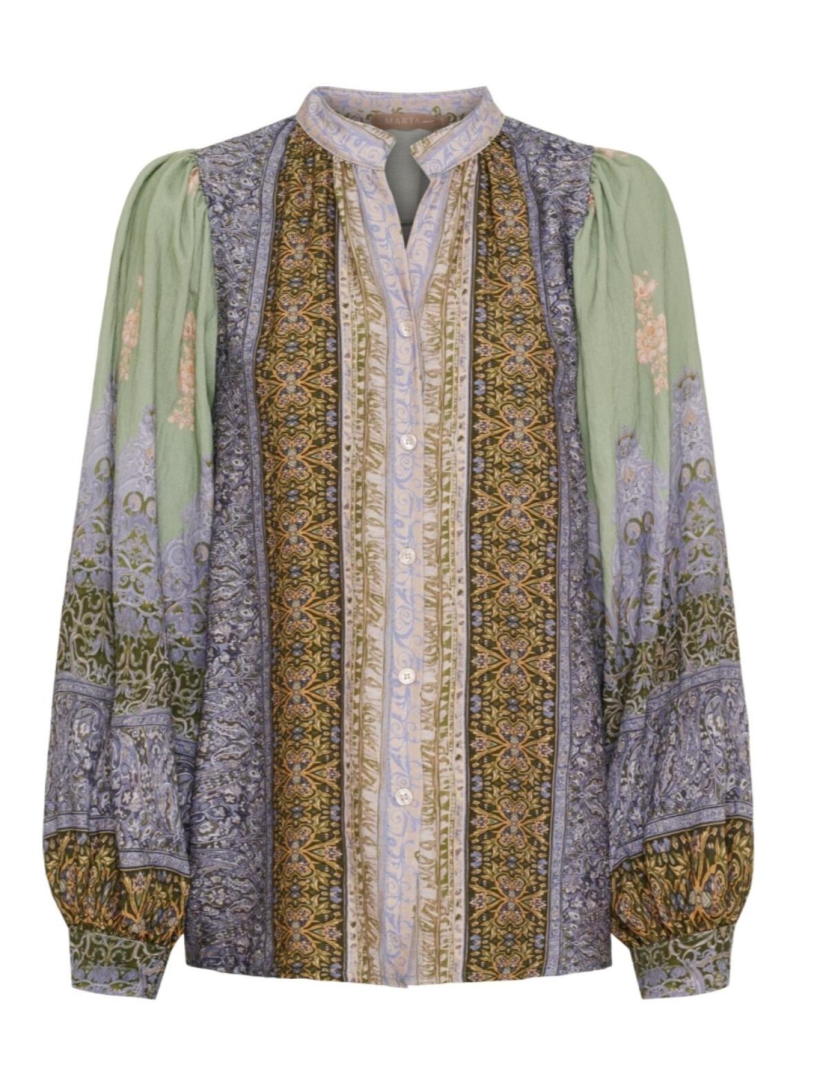 Marta Du Chateau Annette skjorte bluse med krave kant, knapning ned foran og lange ballon ærmer med manchet ved håndleddet. Det flotte pasley print i blå og grønne nuancer giver en rolig, feminin stemning, og den bløde kvalitet på 90 % viscose og 10 % polyester falder let og behageligt mod huden.