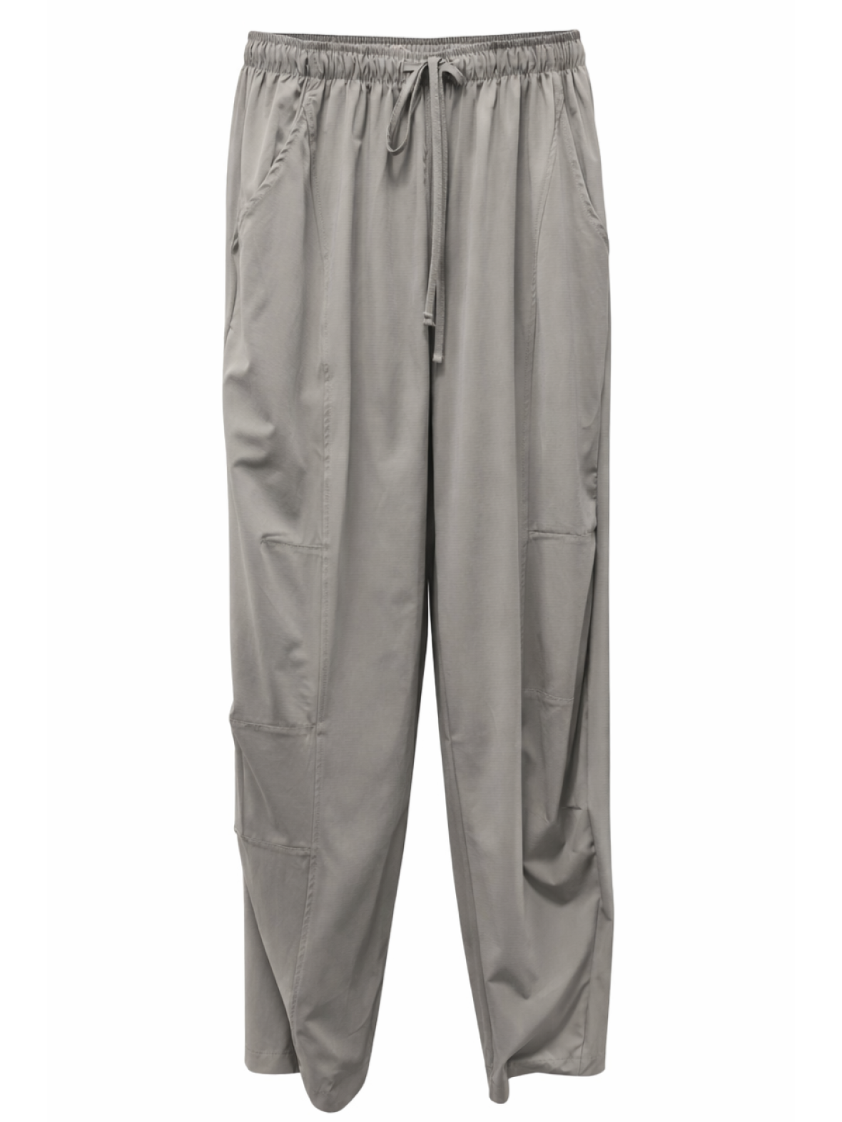 Isa-buksen er udført i lækkert faldskærmsstof med et blødt fald. Den har elastik og snor i taljen, skrålommer foran og påsatte baglommer samt en let barrel-facon, som skaber bevægelsesfrihed og en afslappet, feminin silhuet. Stoffets varme khaki-brune nuance giver et roligt og sofistikeret udtryk.