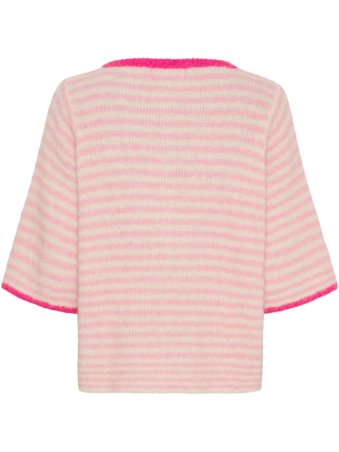 Cardiganen har knapper ned foran og er vandret stribet i offwhite og lyserød med pink kant rundt i halsen og ved ærmerne. Materiale sammensætningen giver let stretch og en behagelig, varm fornemmelse uden at være tung. Passer godt til både hverdag og mere stille, stilfulde looks.