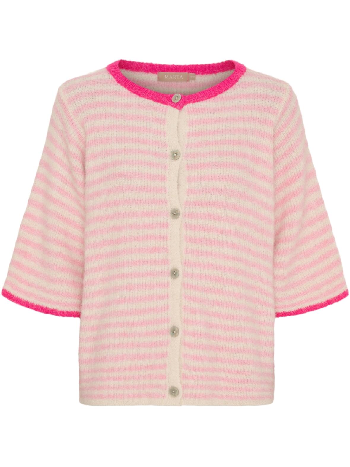 Susanne strik cardigan fra Marta Du Château i pink. En feminin og rolig strik med rund hals og korte ærmer, designet til at give et blødt og indbydende udtryk.