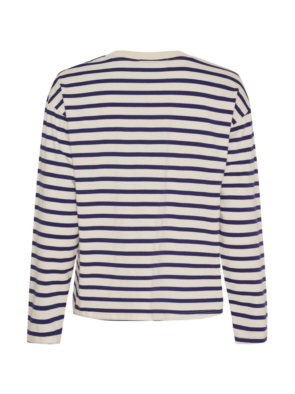 - Detaljer: Ribkant i halsen, lange ærmer, vandrette smalle marine blå striber på offwhite bund
