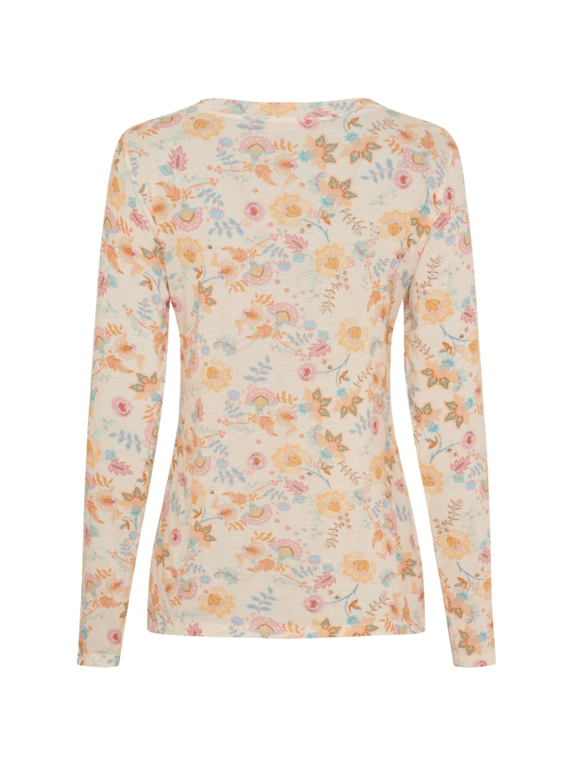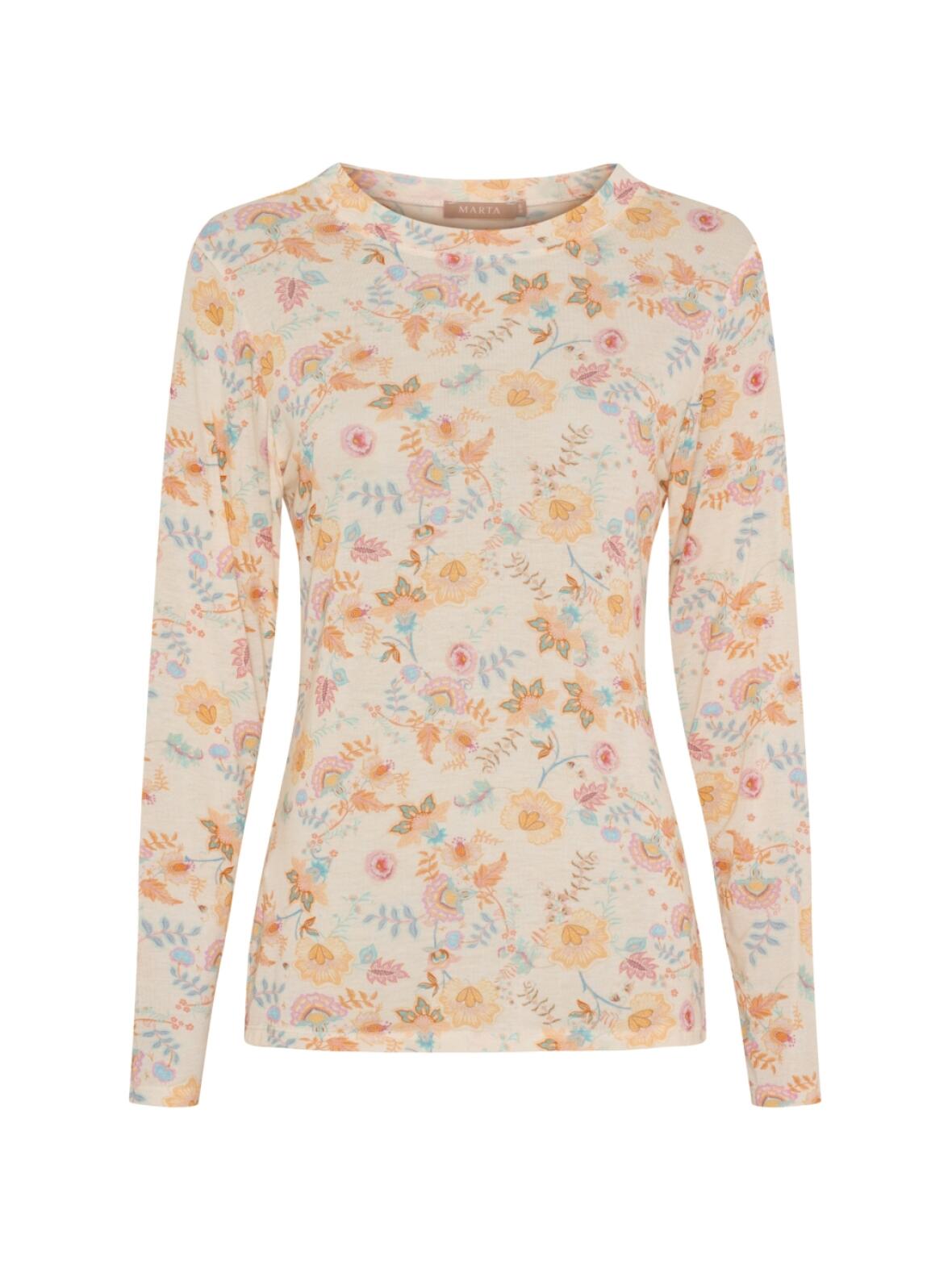 Elissa bluse fra Marta Du Château i varm beige/sart gul med blomsterprint. Langærmet med rund hals, designet som en fin basis body bluse til garderoben.