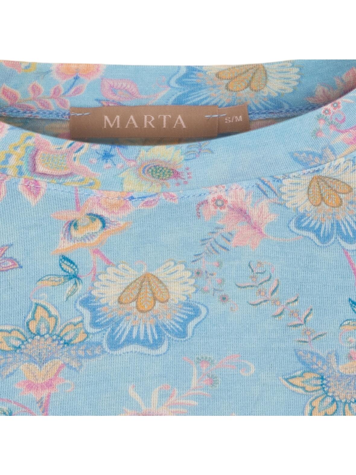 Marta Du Château Elissa langærmet t-shirt med rund hals i let jersey, designet i en klar lyseblå nuance med blomsterprint i orange, rosa og blå. En fin basis body-bluse i blød modalkvalitet med let stretch, der giver en tæt, behagelig pasform og en rolig, feminin stemning.