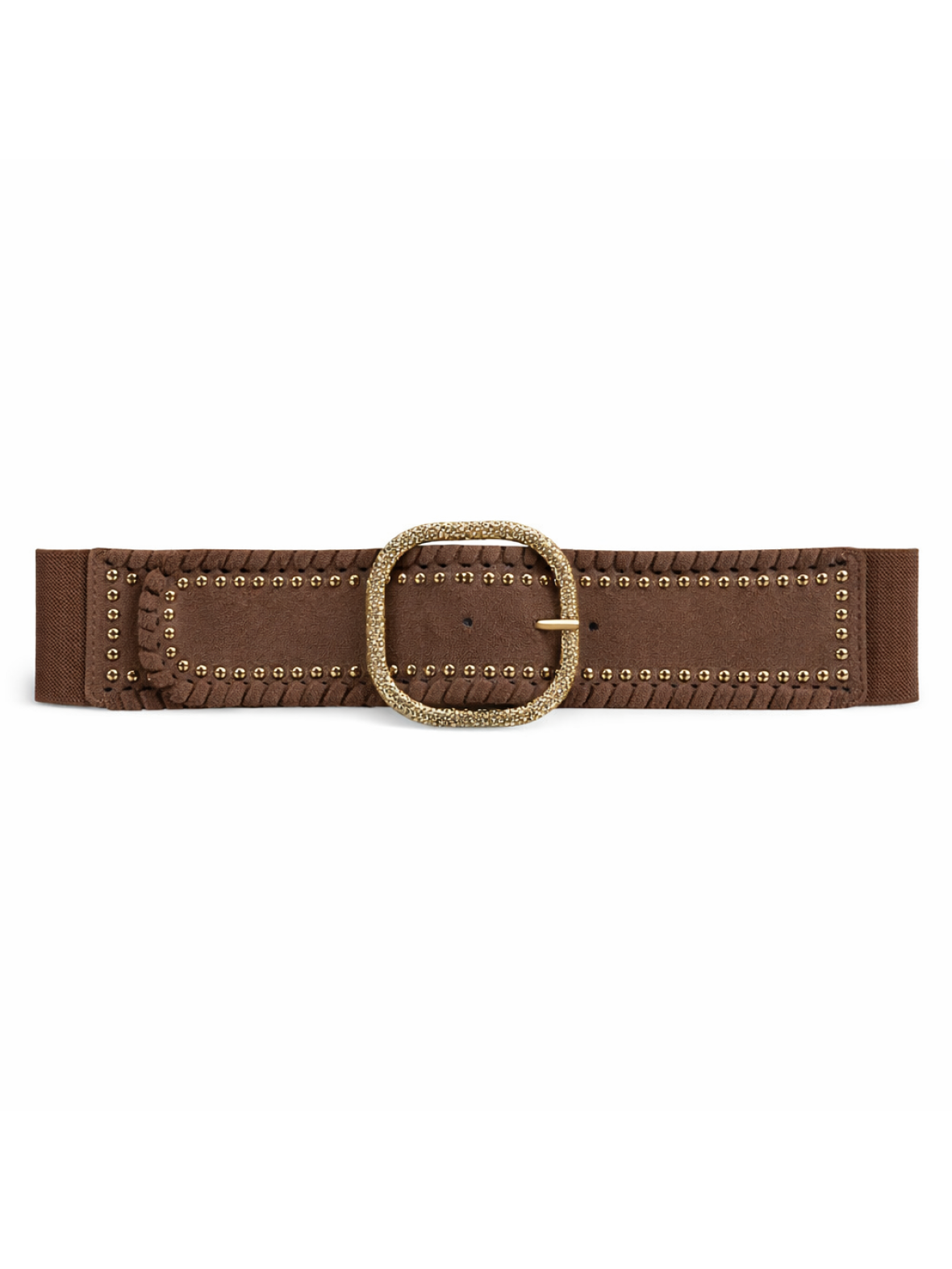 Bæltet har et 6 cm bredt elastikstykke og et blødt ruskindslook, afsluttet med guldfarvede nitter i begge ender, hvilket giver et subtilt og varmt indtryk. Spændet er firkantet og tilfører et klassisk, men moderne udtryk, mens den elastiske pasform i onezise følger taljen komfortabelt uden at stramme. Stemningen er afdæmpet og feminin, velegnet til både hverdagsbrug og mere polerede looks.