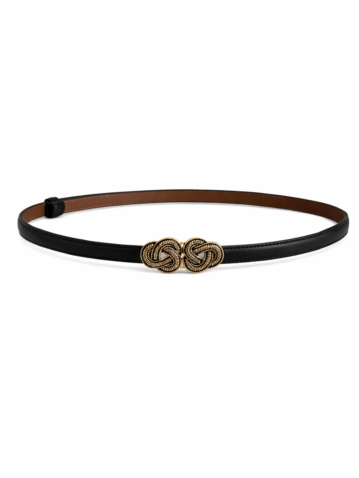 Bæltet har en enkel, elegant linje med reguleringsmulighed, så det kan tilpasses forskellige talje vidder. Det flotte guldfarvede metalspænde er formet som en keltisk knude og giver et luksuriøst, men afdæmpet finish. Materialet og den smalle profil skaber en rolig og raffineret stemning, velegnet til både hverdag og mere formelle outfits.