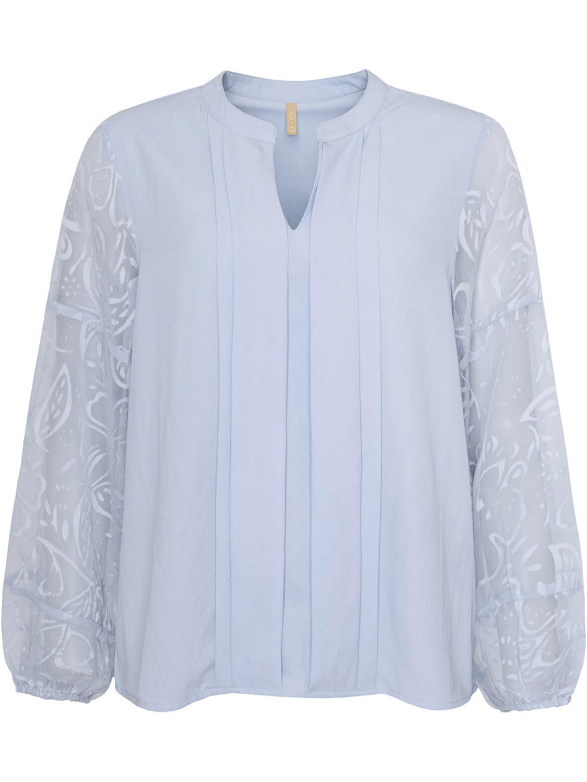 Lyse blå Ofelia Api skjorte bluse med lille v-udskæring foran, læg og lange transparente ballonærmer med blomsterprint. Stoffet er let og glat i 100 % polyester, hvilket giver blusen en luftig og feminin bevægelse uden at virke tung. Pasformen er normal med et let fald, der skaber en afslappet men elegant stemning, velegnet til både hverdag og mere pyntede lejligheder.