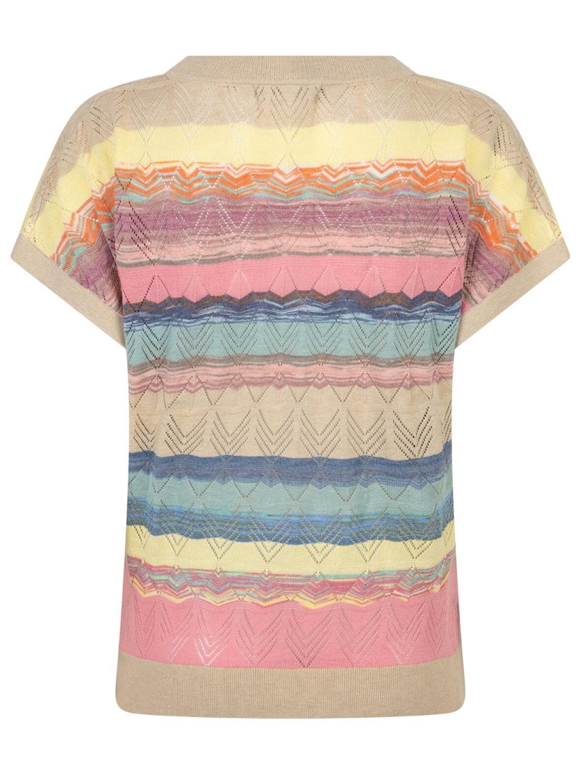 - Detaljer: Rund hals, kort vingeærme, ribkant i hals/forneden/ærmer, hulmønster, vandrette striber