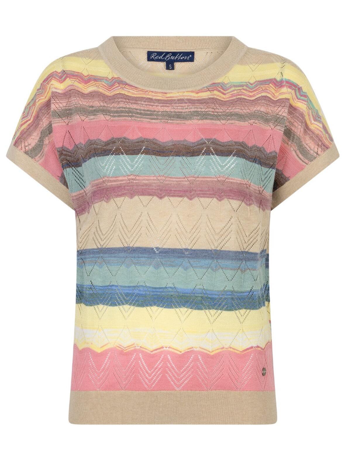 Red Button Jerry strik bluse med rund hals og kort vingeærme. Blusen har ribkant i hals, forneden og i ærmerne og et hulmønstret strik, som giver luft og tekstur. Pasformen er afslappet men feminin, behagelig at have på og velegnet til både hverdag og mere pyntede lejligheder, hvor farverne tilfører en rolig, sommerlig stemning.