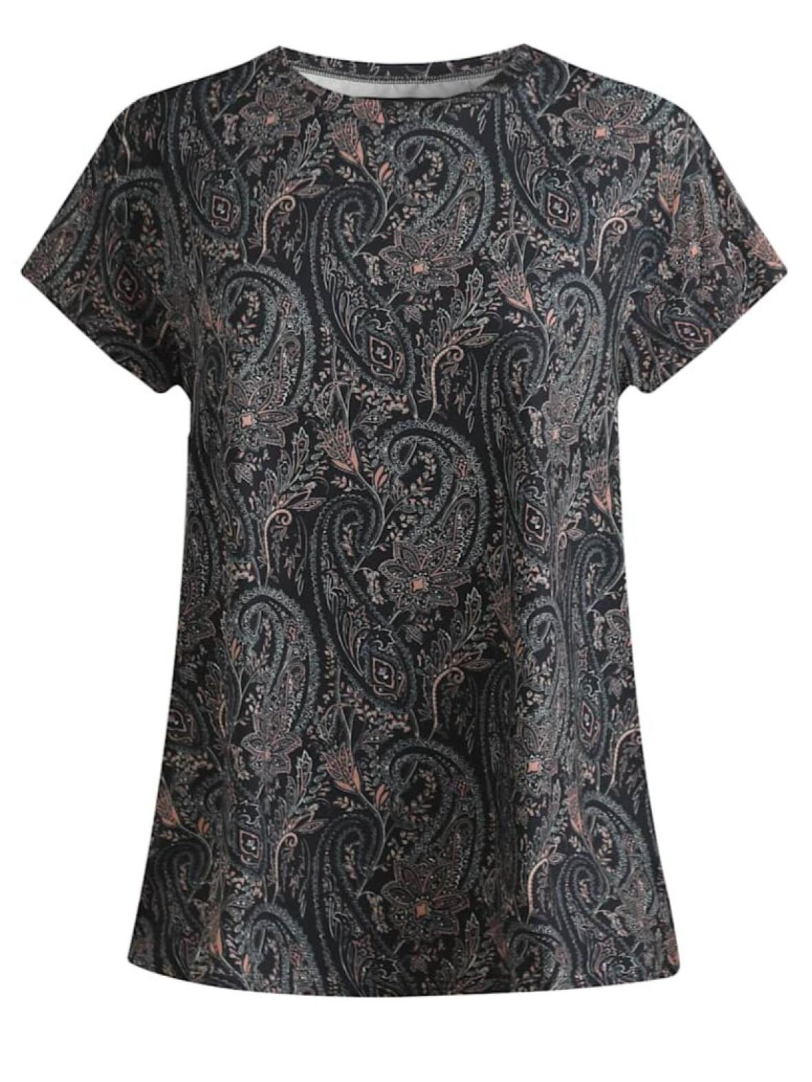 T-shirten er designet til afslappet elegance med en let, blød kvalitet og en afslappet silhouet, der falder flot uden at være for stor. Detaljerne — rund hals, korte vingeærmer og det diskrete paisley-print — skaber en sart, men moderne stemning, som fungerer både til hverdag og mere polerede looks.