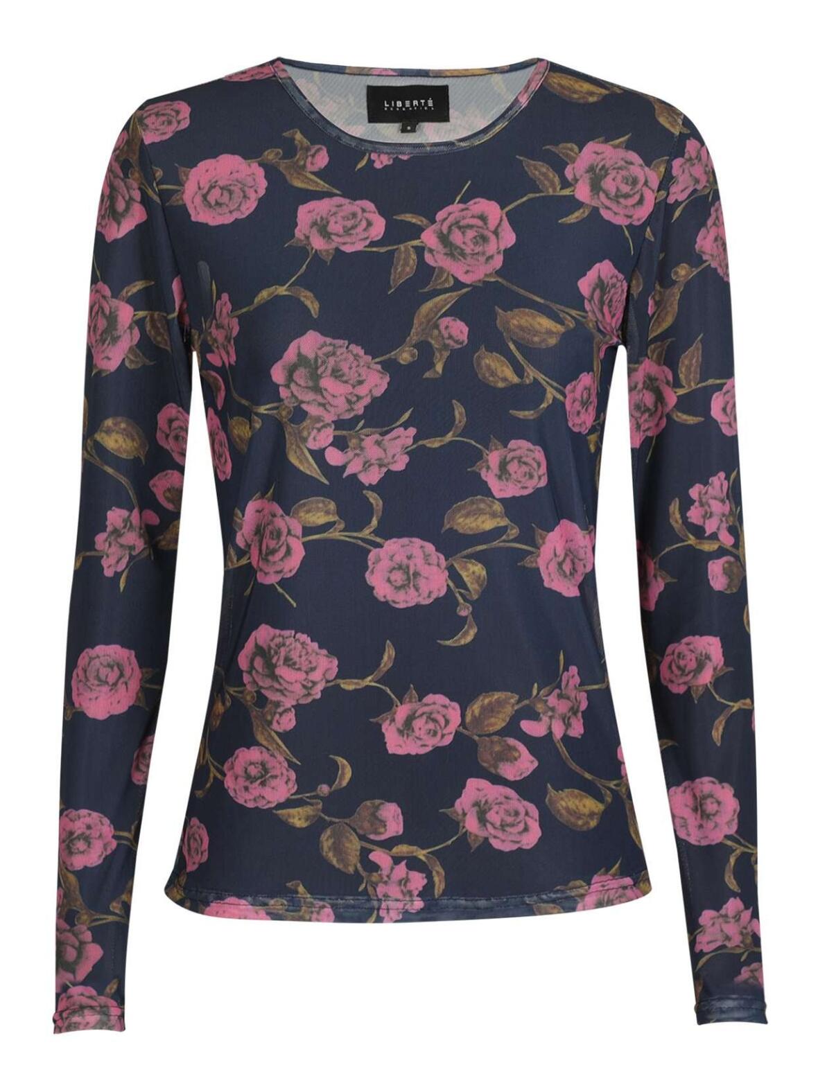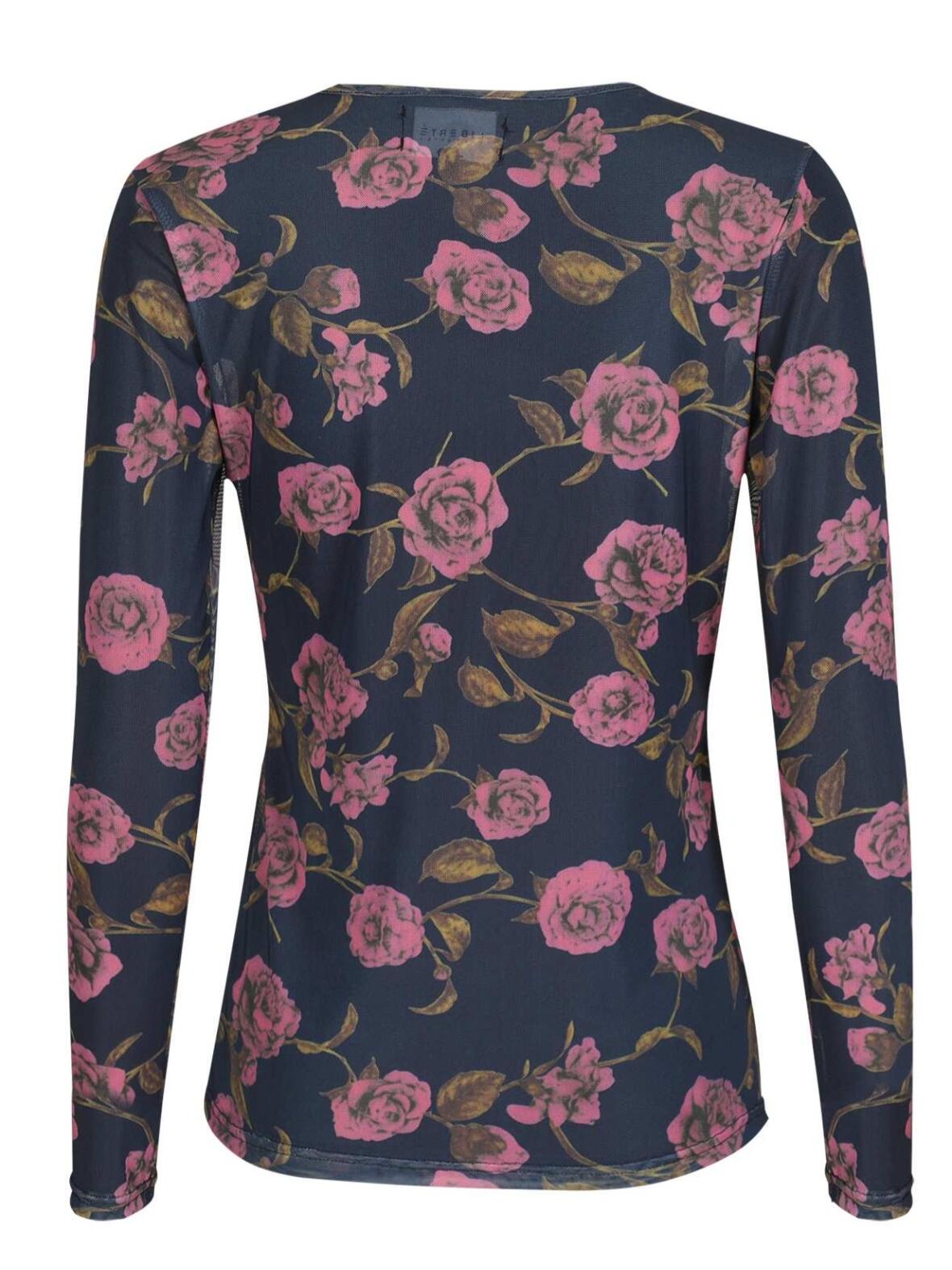 Libertè mesh bluse i marine blå med roser i mørk pink, rund hals og lange ærmer.