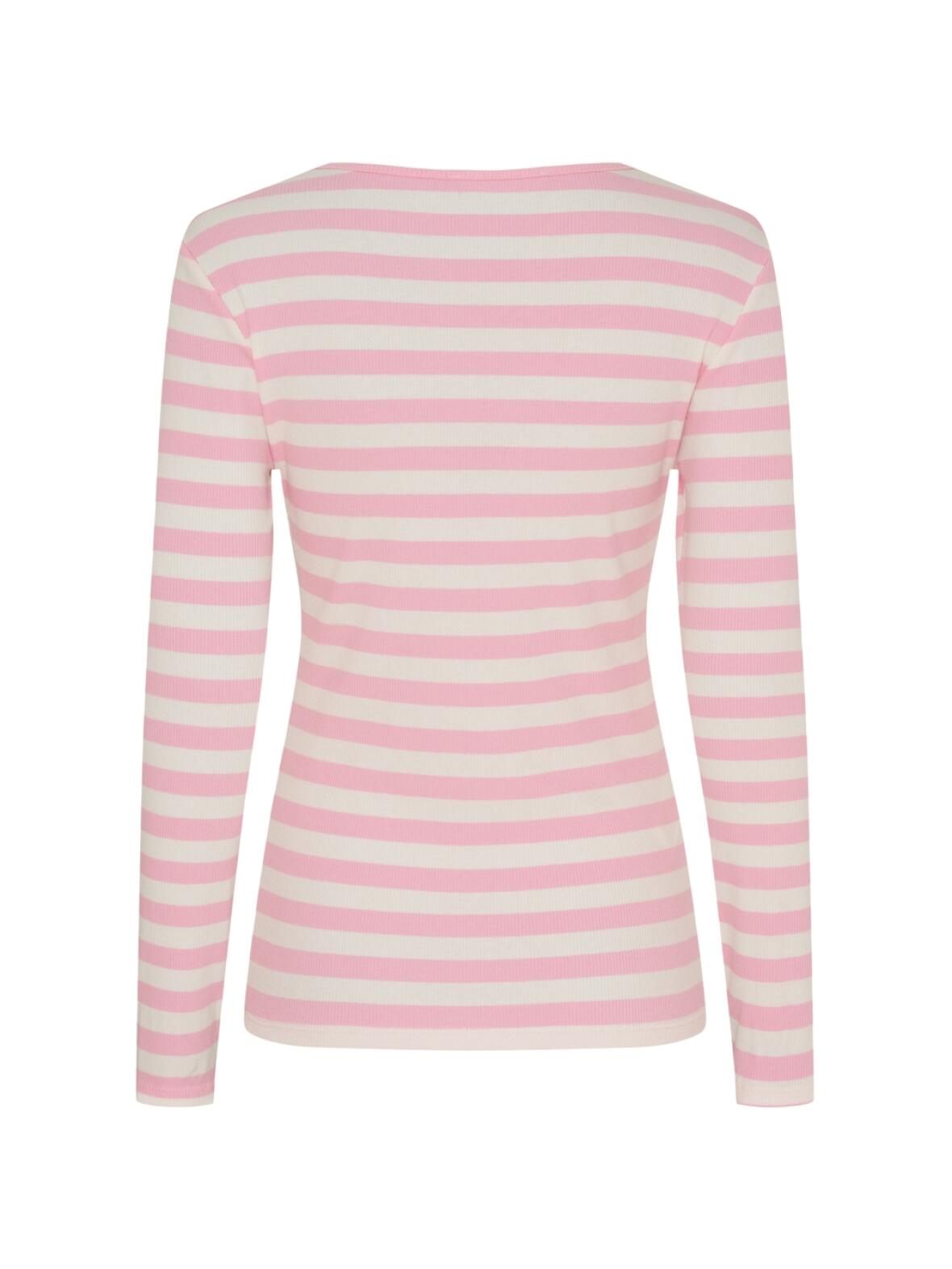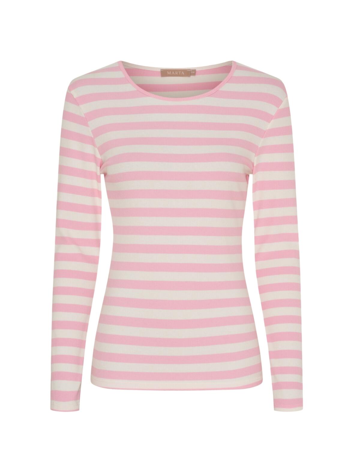 Marta Du Chateau Begonia t-shirt med rund hals og lange ærmer. Lækker ribkvalitet i vandrette striber i lyserød og offwhite. Blød kvalitet i viscose med elastan giver en behagelig, let figurformet pasform og en rolig, feminin stemning.