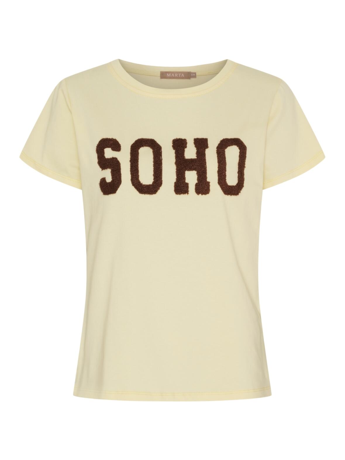 Marta Du Chateau Herdis t-shirt har rund hals og korte ærmer med et roligt udtryk. Den sarte gule nuance og "SOHO" i lys brun froté på brystet giver et diskret, teksturfyldt detaljeret look. Stoffet med 95 % bomuld og 5 % elastan føles blødt mod huden og giver en behagelig, let tætsiddende pasform, der bevarer en afslappet og feminin stemning.