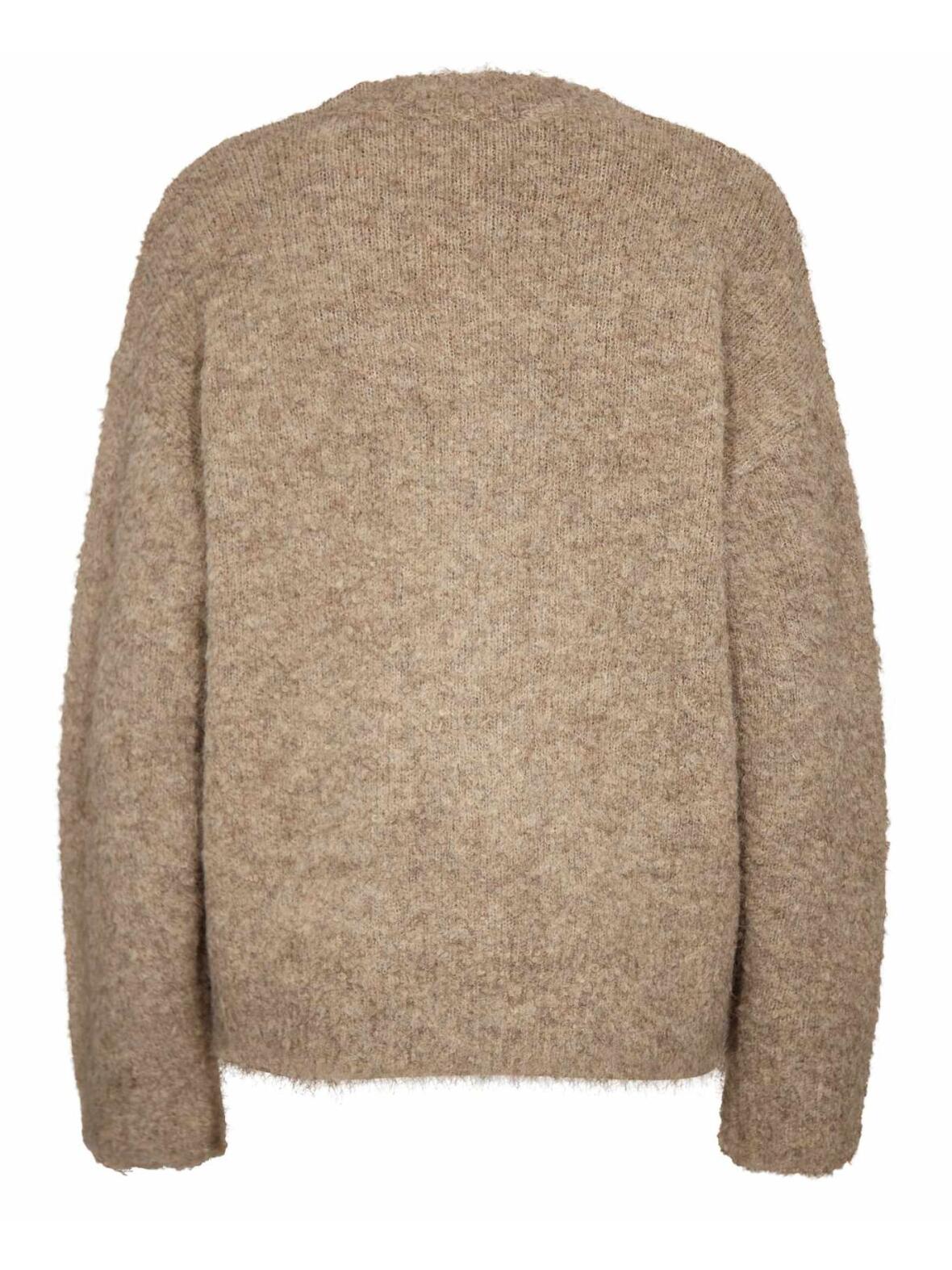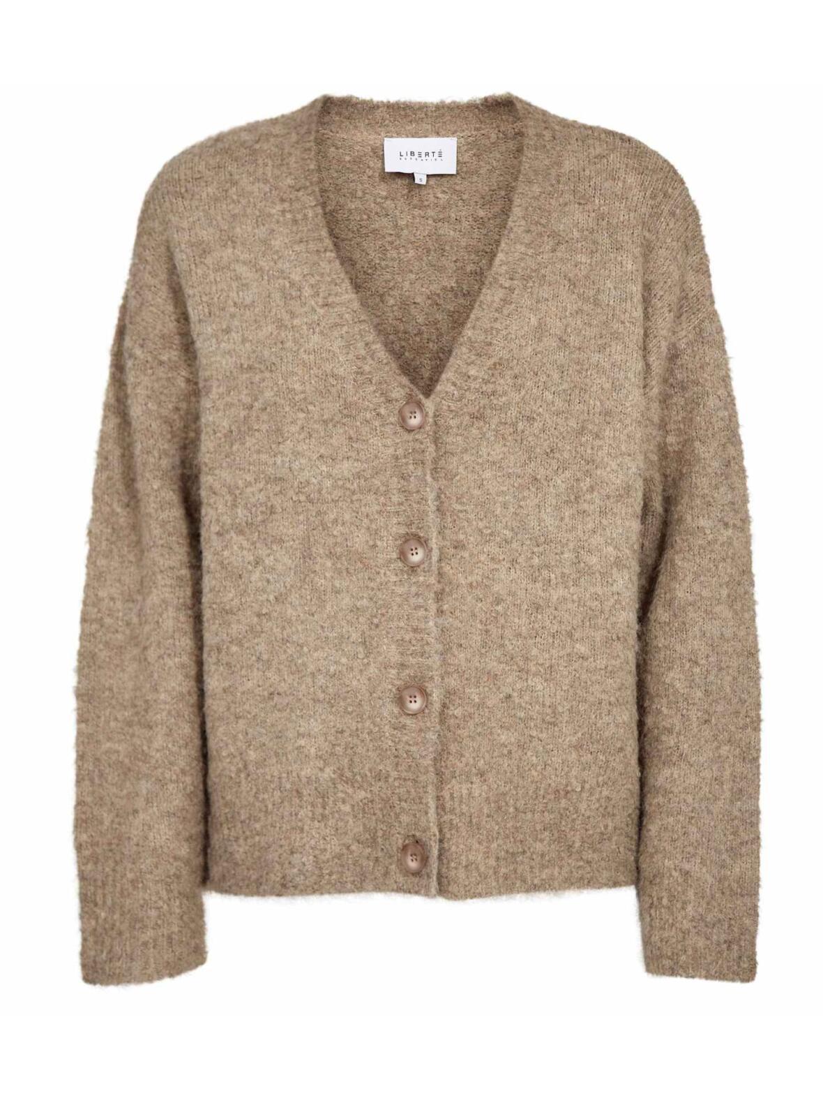 Liberté Lou chenille strik cardigan med v-hals, lange ærmer og knapper ned foran i en flot mørk sand melange.