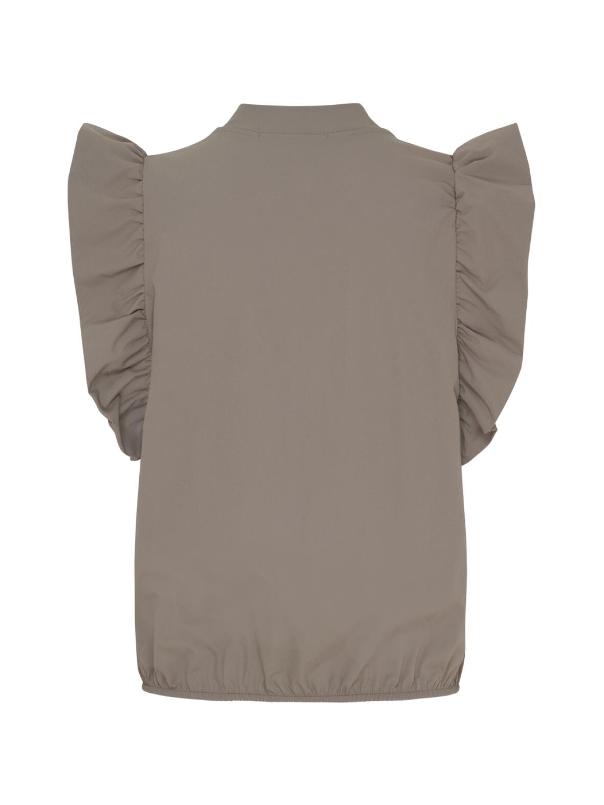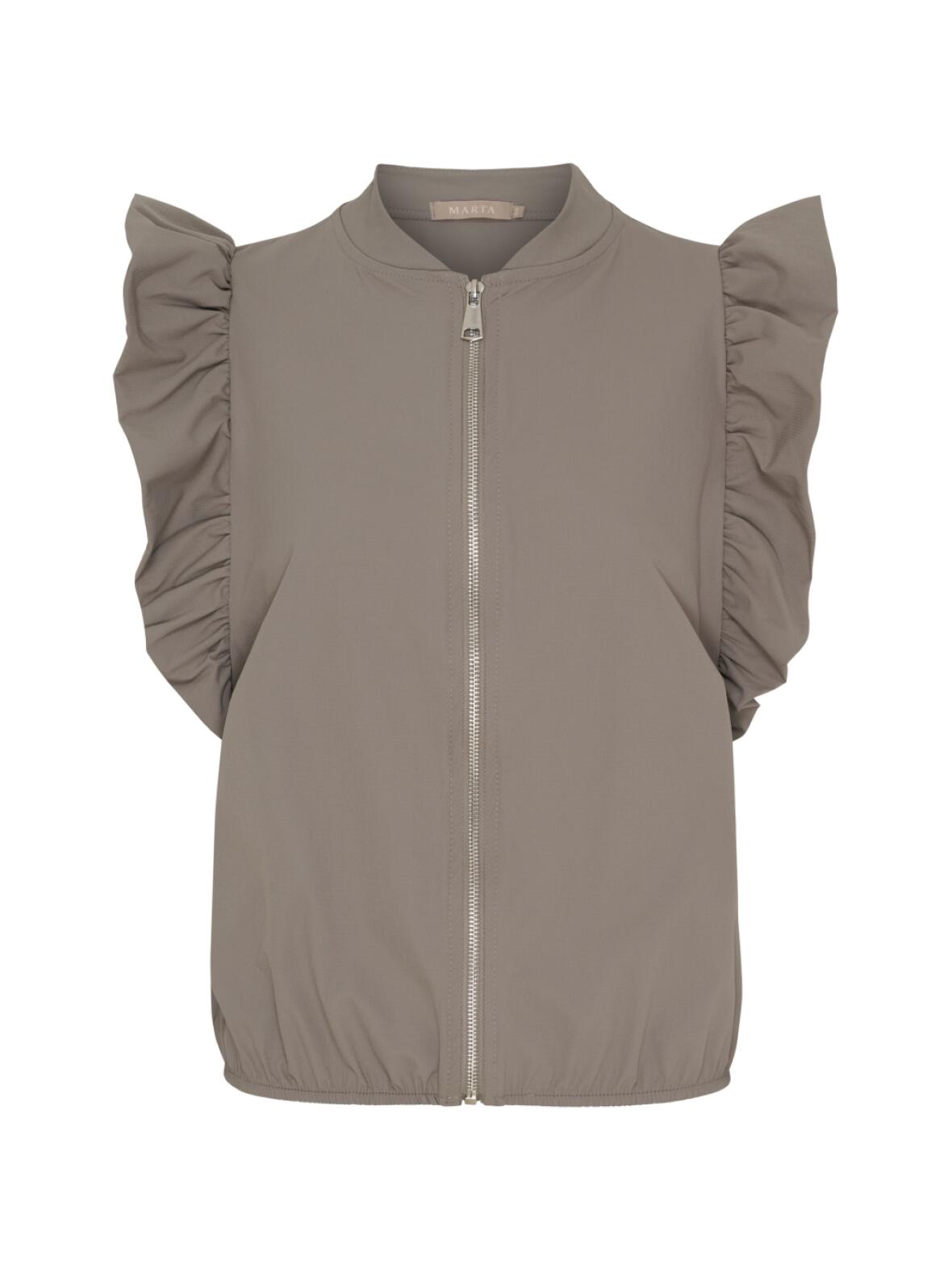 Vesten har en let faldskærmskvalitet med flæse over skulderen og rundt i ærmegabet, lynlås samt elastikkant forneden, hvilket skaber en harmonisk silhuet med et afslappet, men velovervejet udtryk. Stoffets fald og de fine detaljer giver et feminint, afdæmpet look, der føles behageligt og let at kombinere.