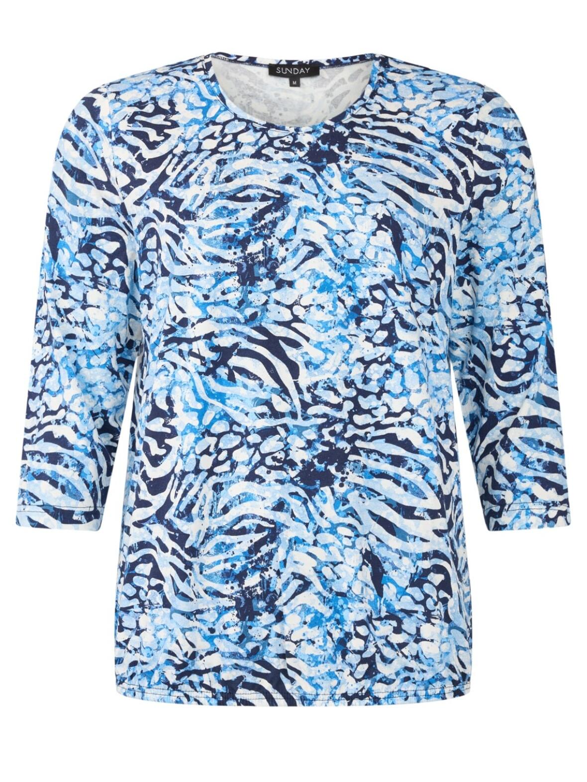 Sunday elastik bluse med rund hals og trekvart ærmer, elastikkant forneden og et flot print i blå nuancer. Stoffet falder blødt og følger kroppen uden at stramme, takket være blandingen af viskose og elastan. Passer til både hverdag og mere afslappede arrangementer, og giver et roligt, elegant indtryk.