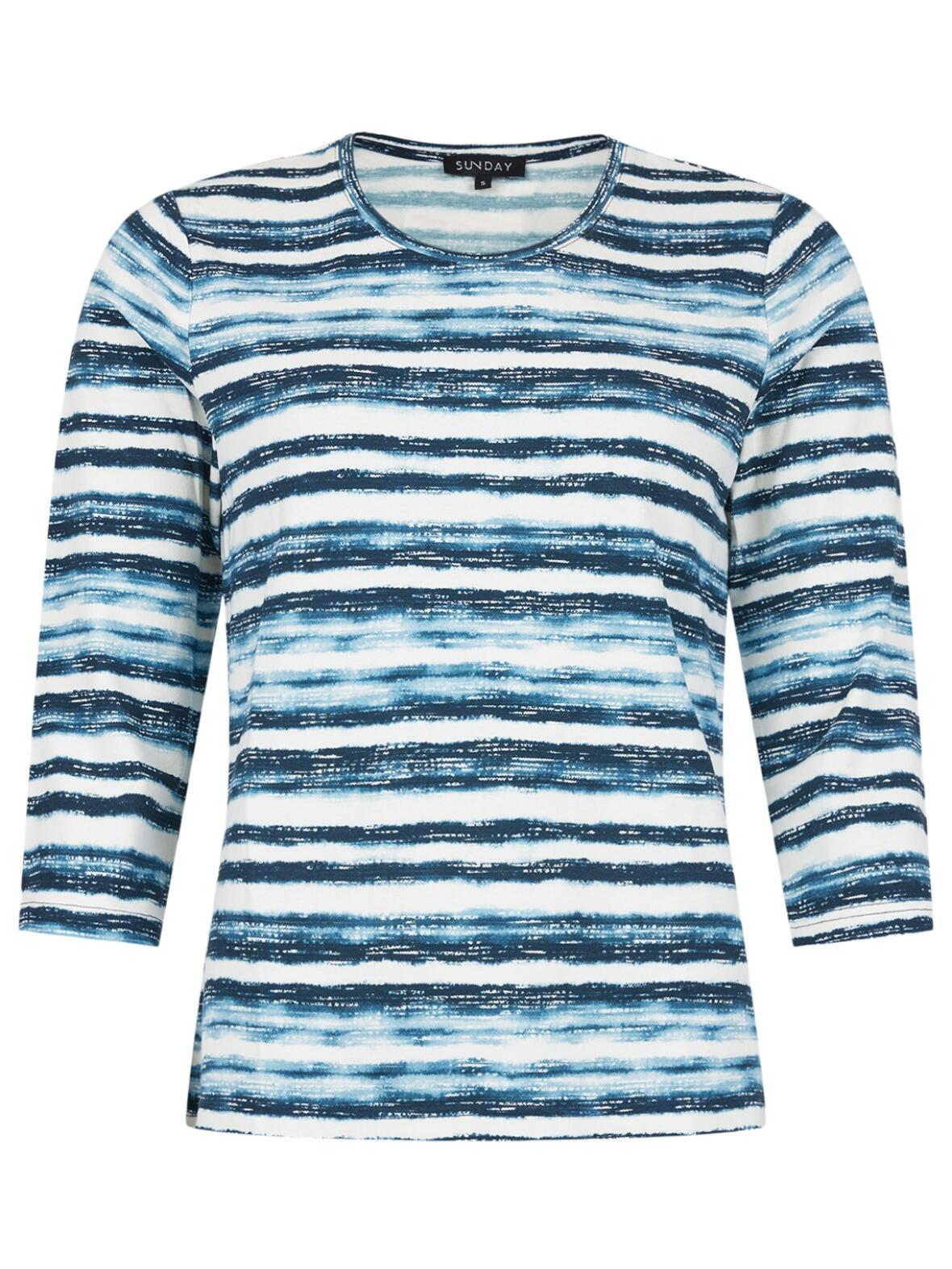 Bluse fra Sunday i blåt print. En rolig og feminin bluse med rund hals og trekvart ærmer, designet i en blød farvepalette af blå og hvide nuancer.