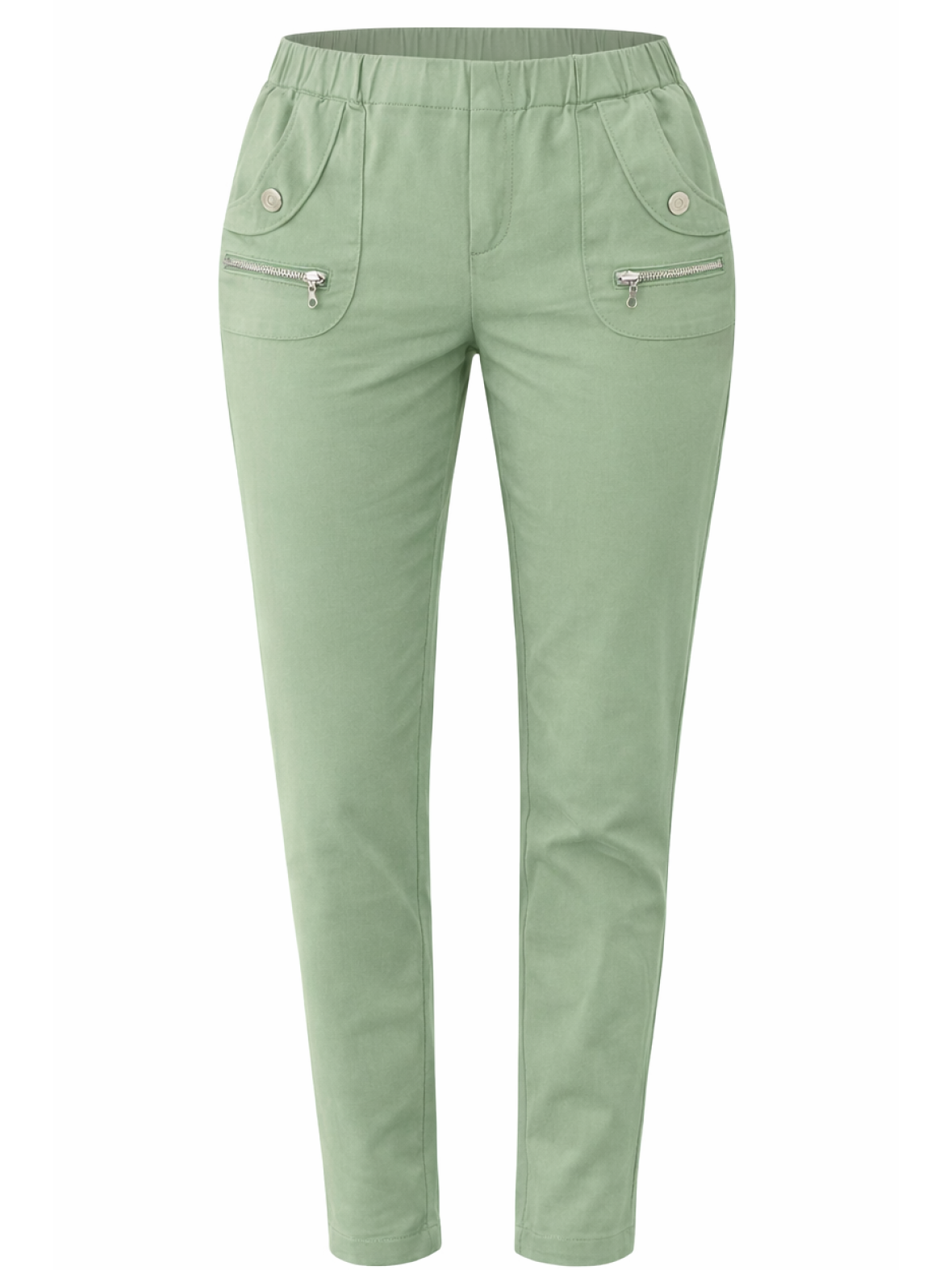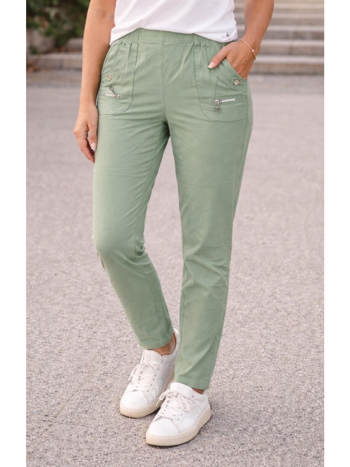 Vanting buks i mint med elastik i taljen, lommer med lynlås og knap pynt foran. Glat bagside uden lommer og moderat lår- og benvidde skaber en behagelig pasform og en afslappet, men sofistikeret stemning. Stoffet falder blødt og føles let mod huden, velegnet til både hverdag og mere afdæmpede anledninger.