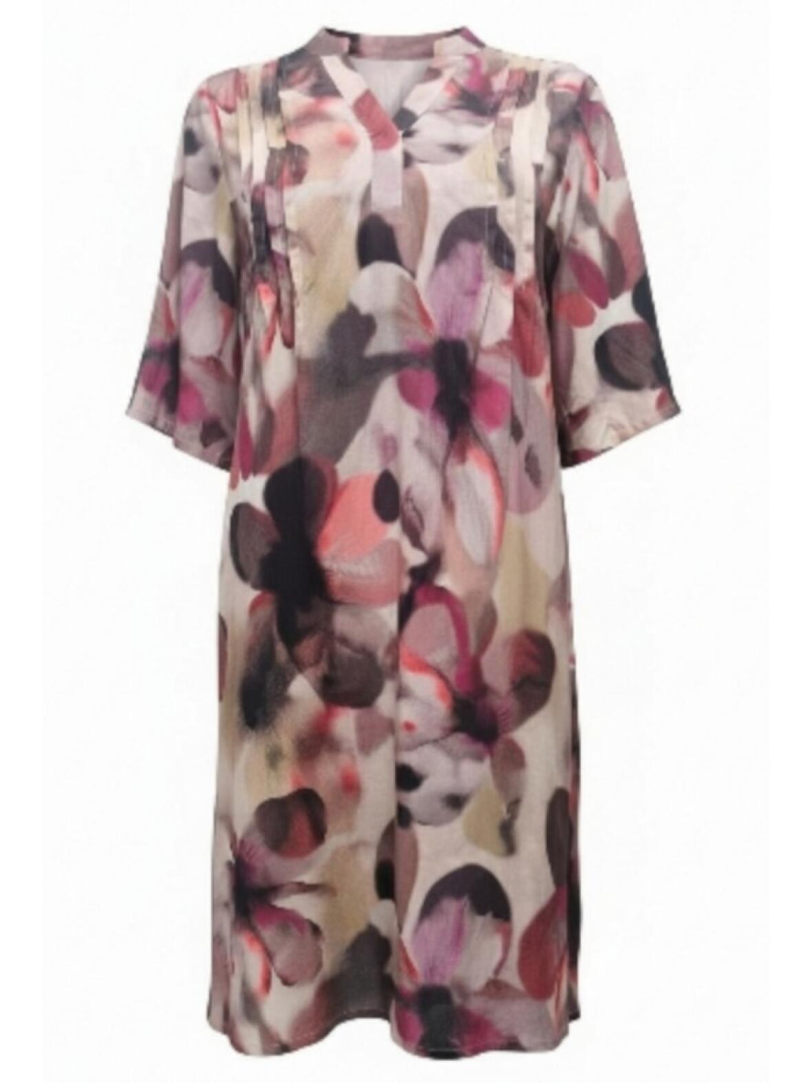 Tunikaen har korte ærmer, V-hals med stolpelukning og knapper foran samt et læg på brystet, der giver et flot fald. Sidesømmen har praktiske lommer, og det store mønstrede print i lavendel og beige tilfører liv uden at være vovet. Materialet er let viscose, som falder blødt og giver en behagelig, afslappet pasform.