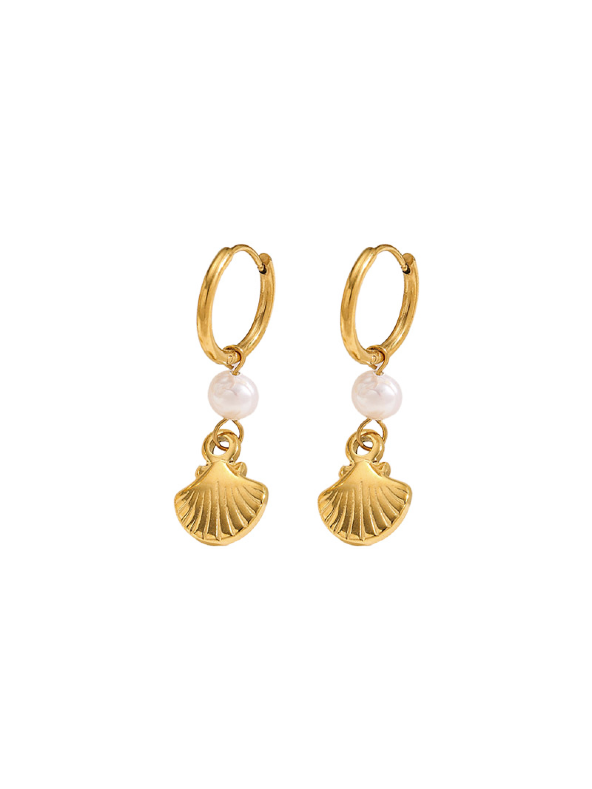 Ørering fra Bay by Aqua Dulce i guldfarvet. Beach hoop ørering med vedhæng formet som små muslingeskaller og en enkelt perle, der giver et subtilt, feminint udtryk.