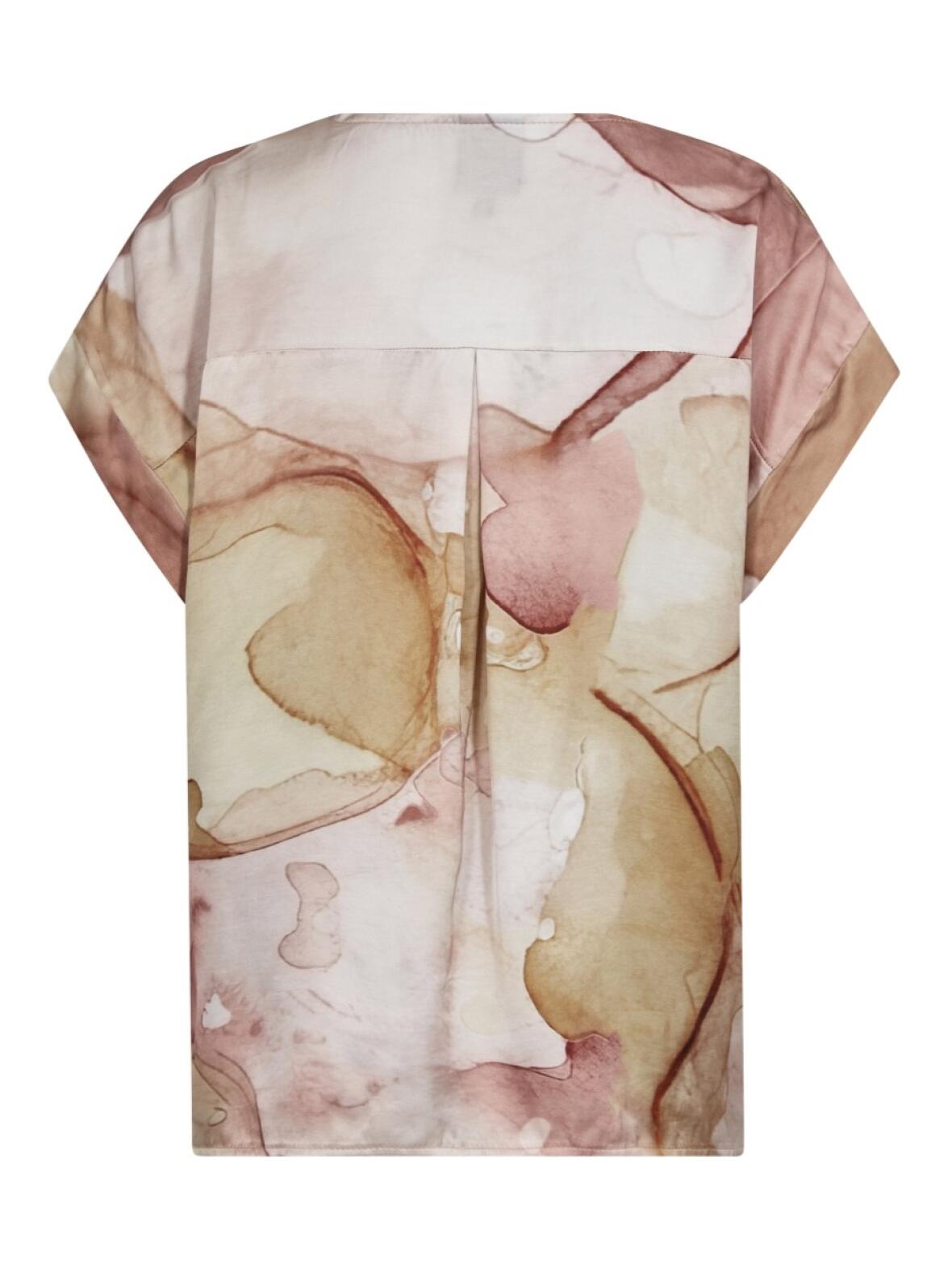En feminin bluse med v-halsudskæring og korte vingeærmer i en blød satinkvalitet, der giver et let og elegant fald. Farvespillet i rosa og brunlige nuancer skaber et roligt og sofistikeret udtryk, og stoffet i 100 % viscose føles behageligt mod huden. Blusen har en afslappet pasform, der både fungerer til hverdag og ved mere pyntede lejligheder.