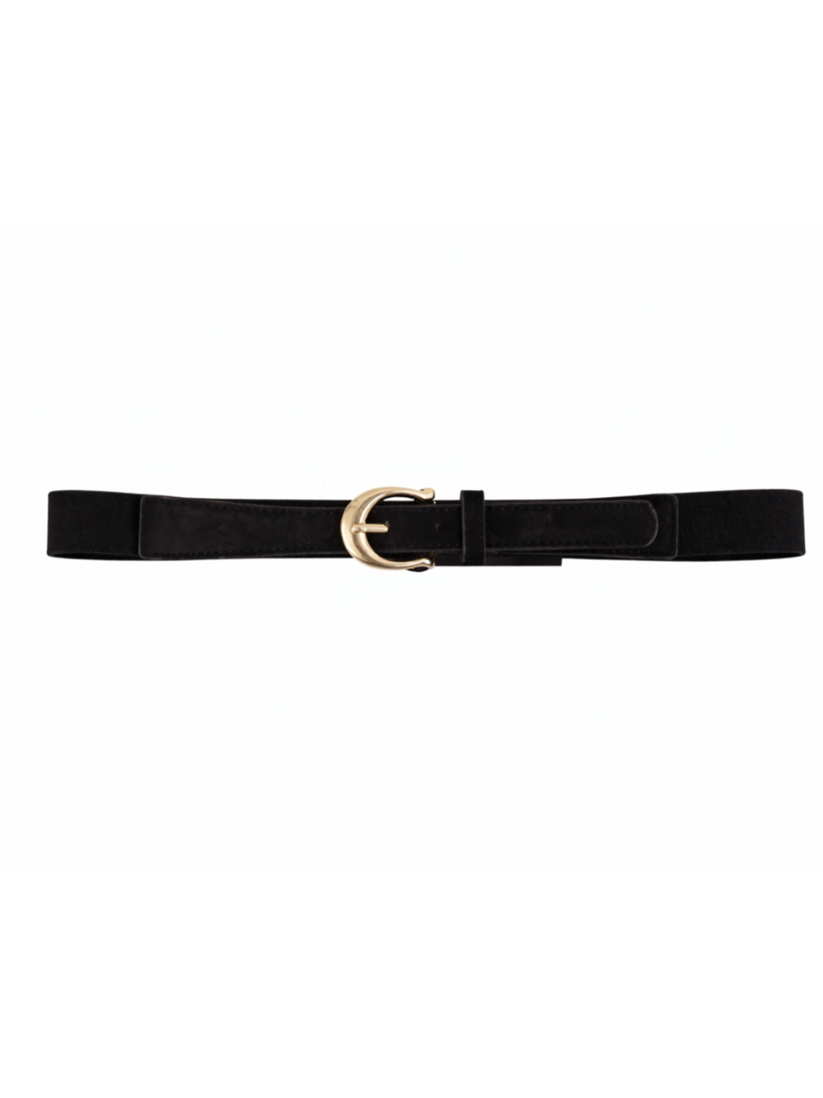 Et enkelt og feminint elastikbælte med 3 cm bredde, begge ender i sort ruskindslook og et fint guldfarvet spænde. Bæltet er designet til at give en blød, rund pasform og løfter et outfit med en afdæmpet, elegant stemning. Den elastiske kvalitet sikrer komfort og gør det nemt at justere, så det sidder flatterende omkring taljen.