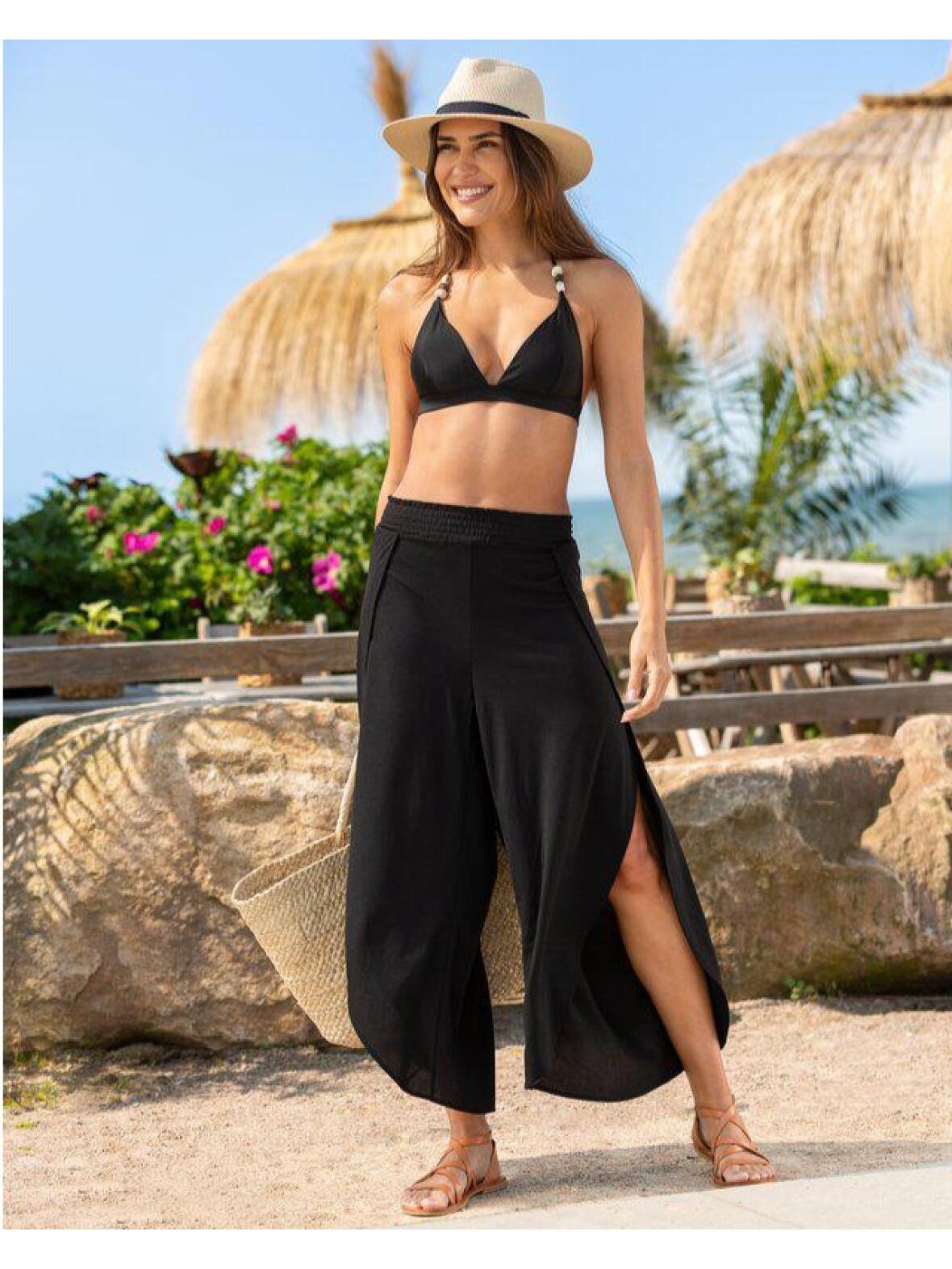 Bukserne har høje slidser foran, afrundede kanter forneden og trekvart længde. Elastik i taljen giver komfort, mens den let elastiske kvalitet sikrer bevægelsesfrihed. Stoffet føles luftigt og falder smukt, velegnet til både afslappede dage ved vandet og lette sommeraftener.