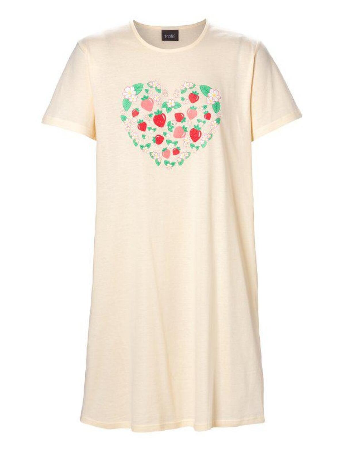 Natkjole fra Trofé i en lys gul nuance. En let big t‑shirt natkjole med rund hals og korte ærmer, dekoreret med blomster og jordbær print i hjertefacon på brystet.