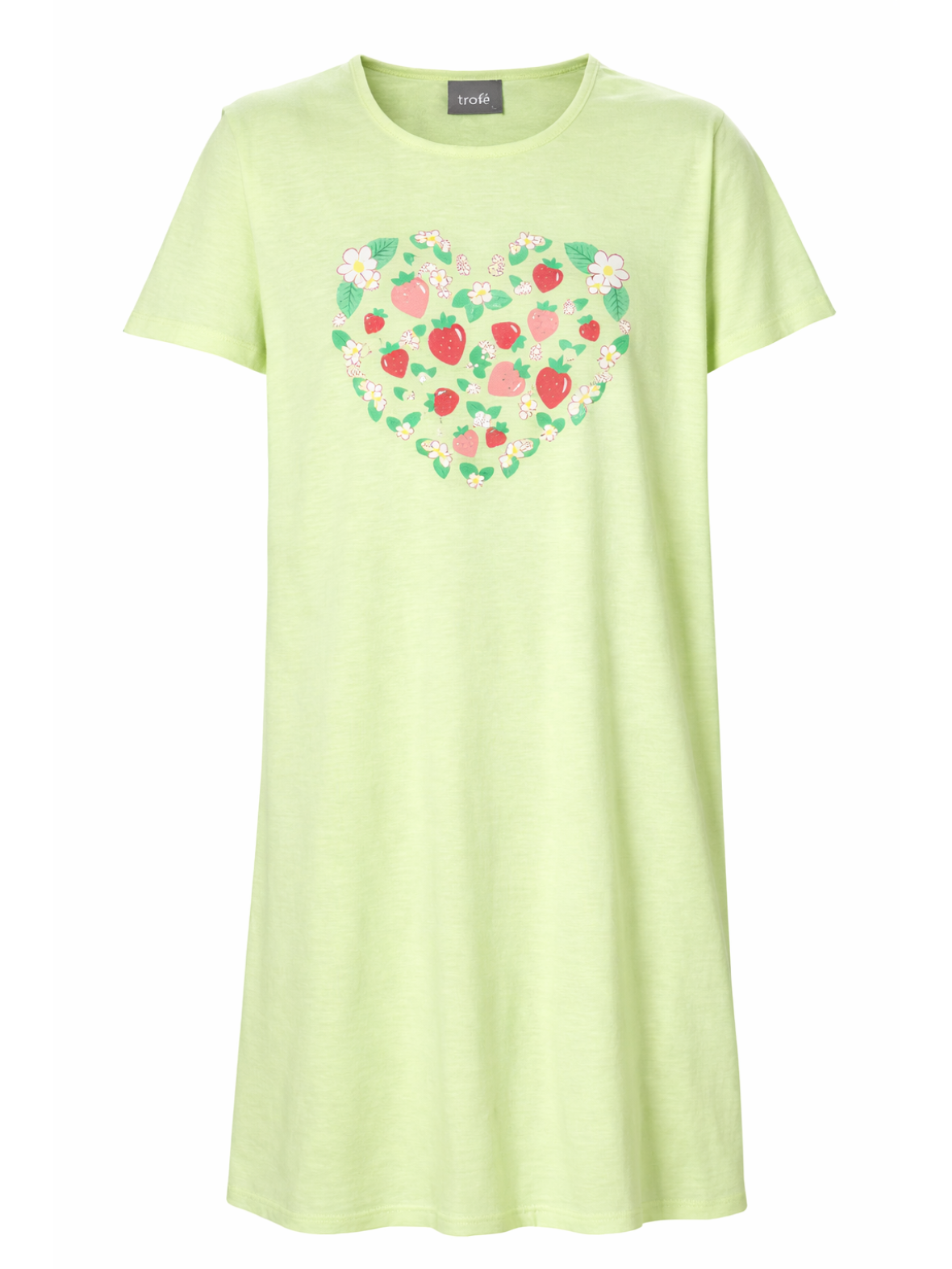 Natkjole fra Trofé i lys grøn. En let big t-shirt natkjole med rund hals og korte ærmer, prydet af blomster og jordbær print i hjertefacon på brystet.