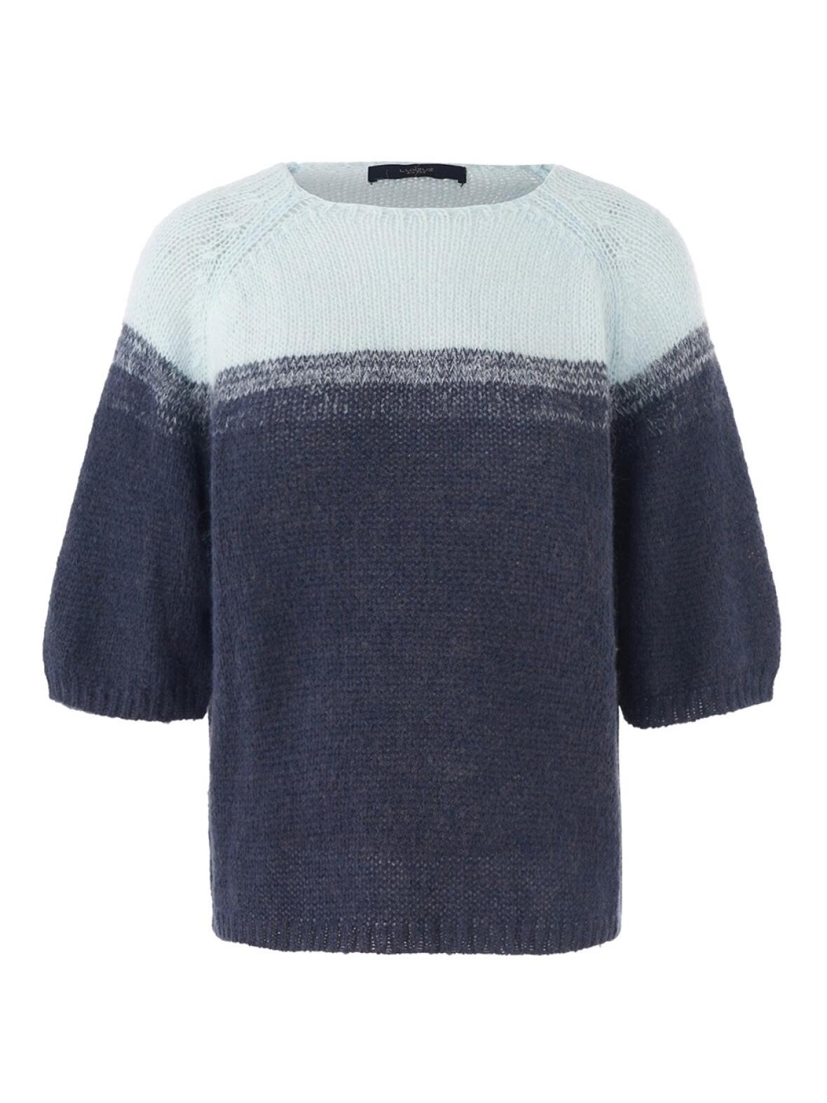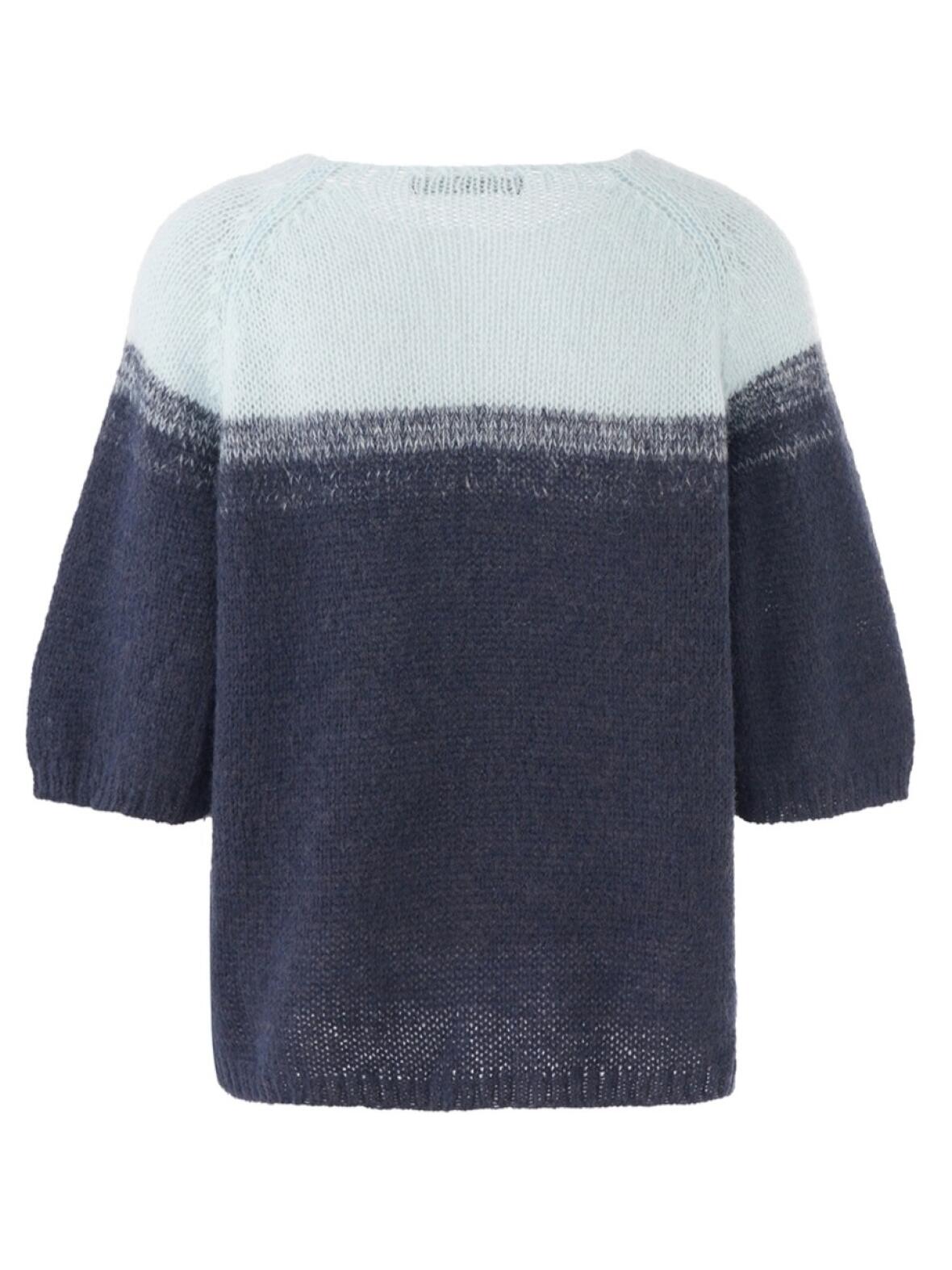 Luxzuz One Two Belenda strikbluse med rund hals og kort raglanærme. Lyseblå foroven med lyseblå og blå melange kant og ensfarvet marineblå forneden skaber et roligt, feminint udtryk. Materiale blandingen giver blødhed og varme uden at være tung, og pasformen er behagelig med lidt plads til bevægelse, så den føles afslappet og elegant.