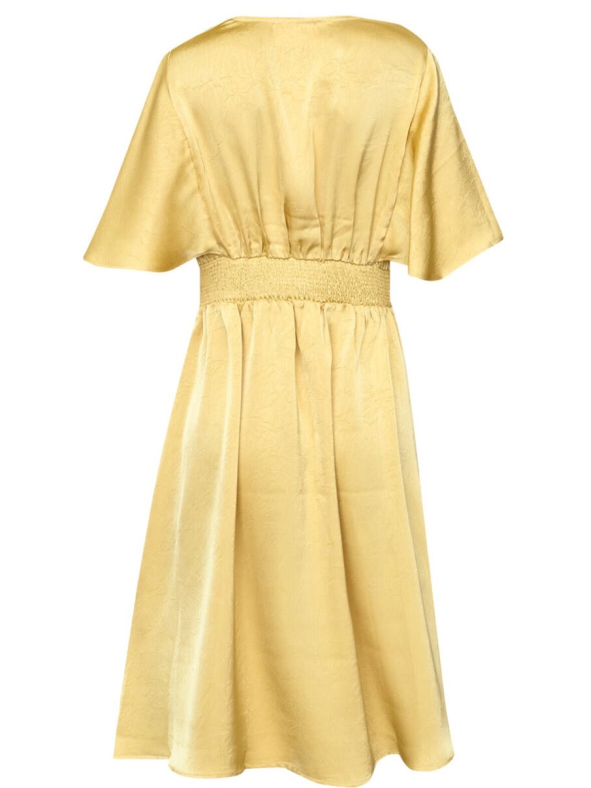 - Detaljer: V-udskæring, fast bånd under brystet, elastik i ryggen, korte vingeærmer, satin-lignende kvalitet med let struktur, midi-længde
