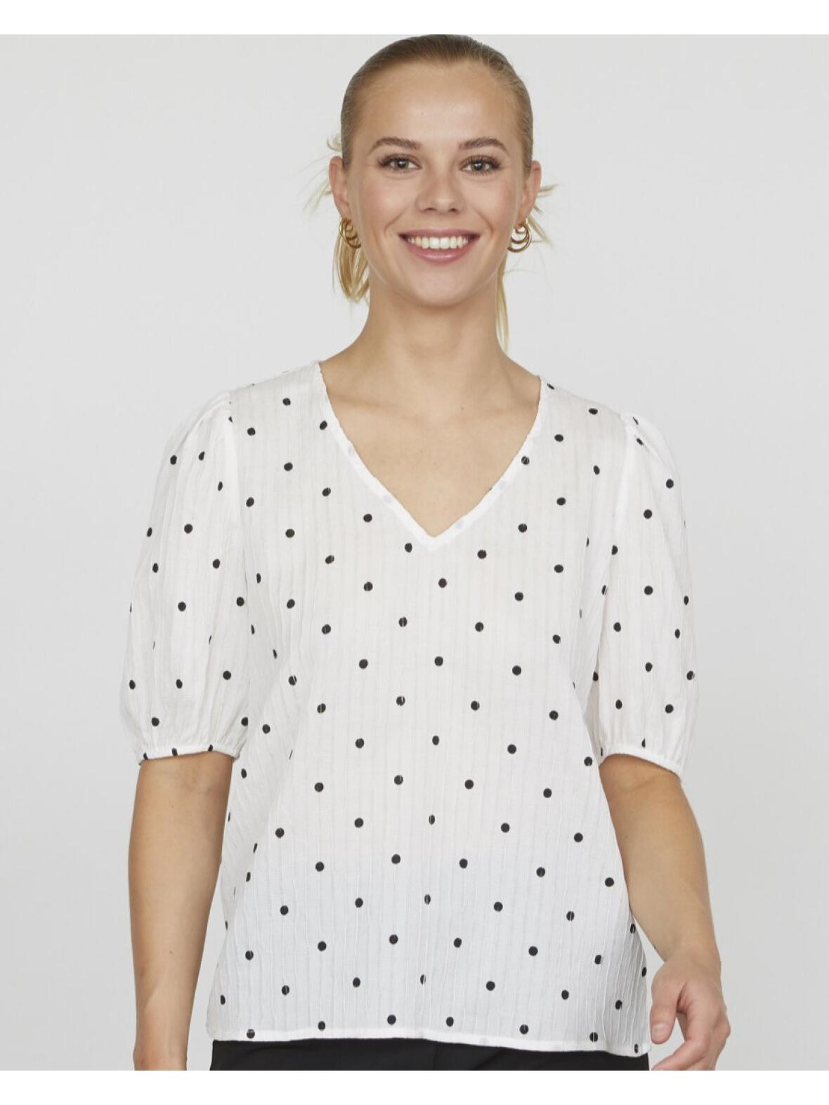 - Detaljer: V-udskæring, korte pufærmer med elastikkant, elastisk skjortestof med strukturmønster og sorte bomber
