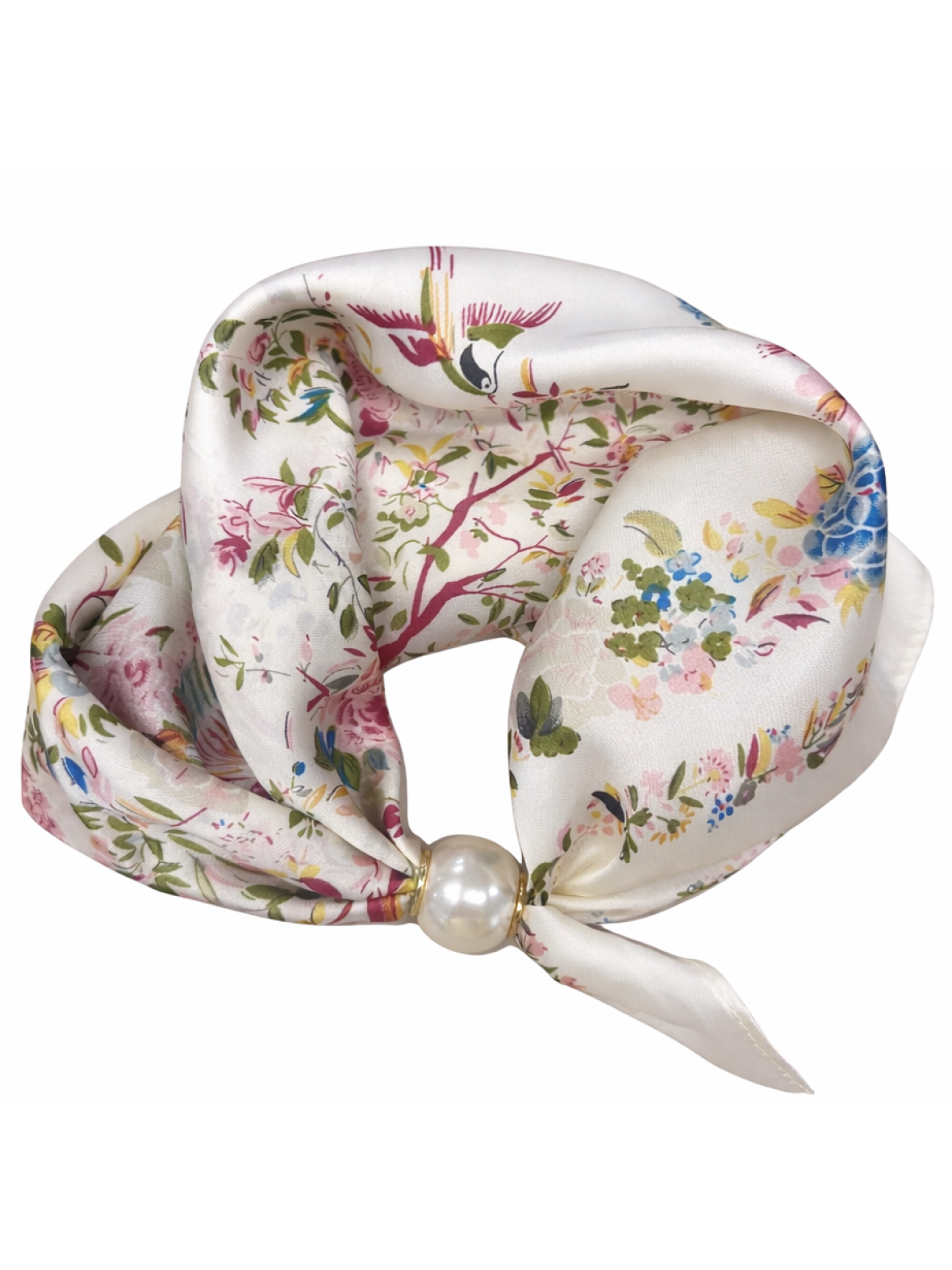 Tørklæde fra Lisbeth Merrild. Et lille, smalt satin tørklæde med creme base og multifarvet blomsterprint.