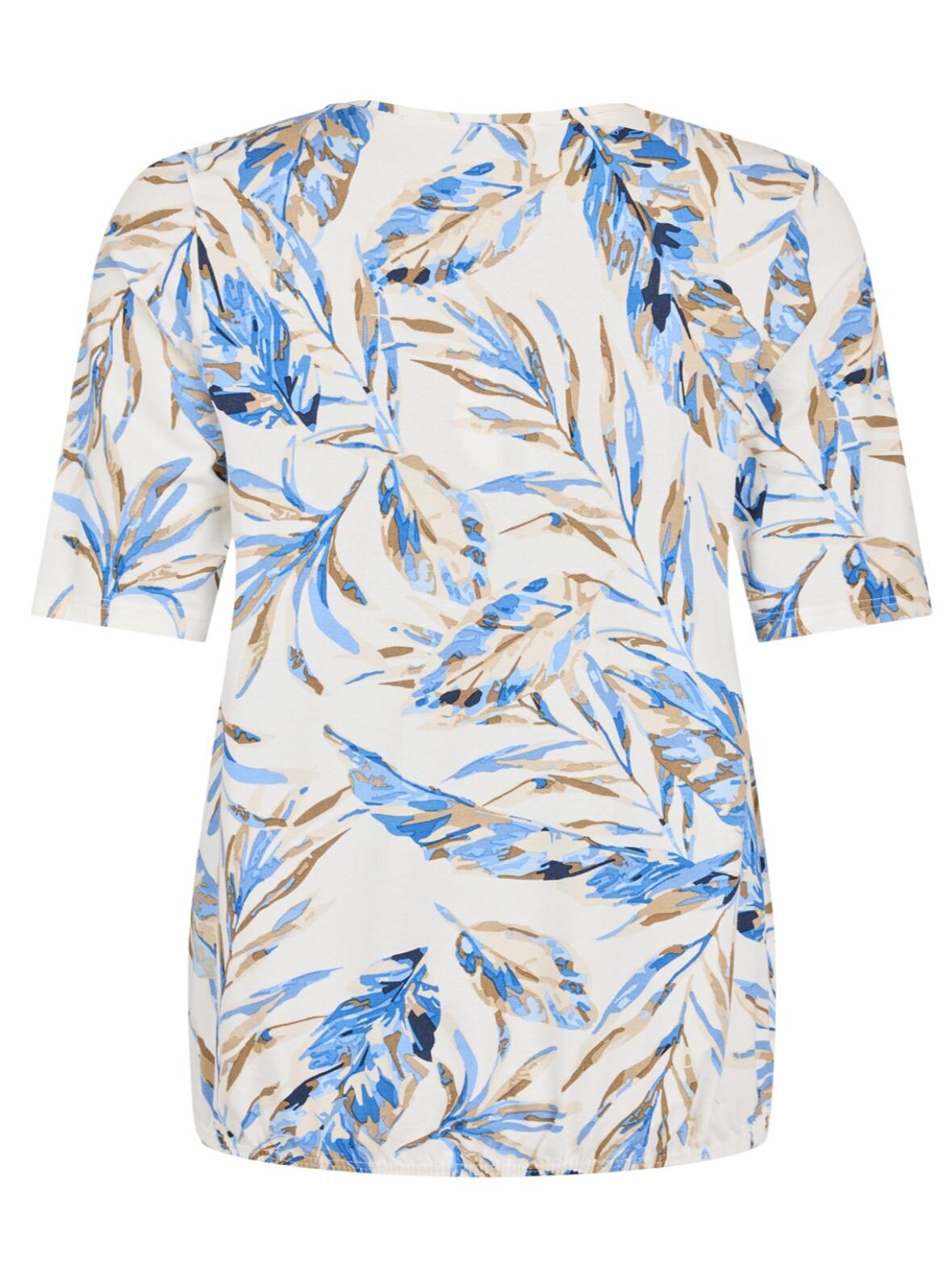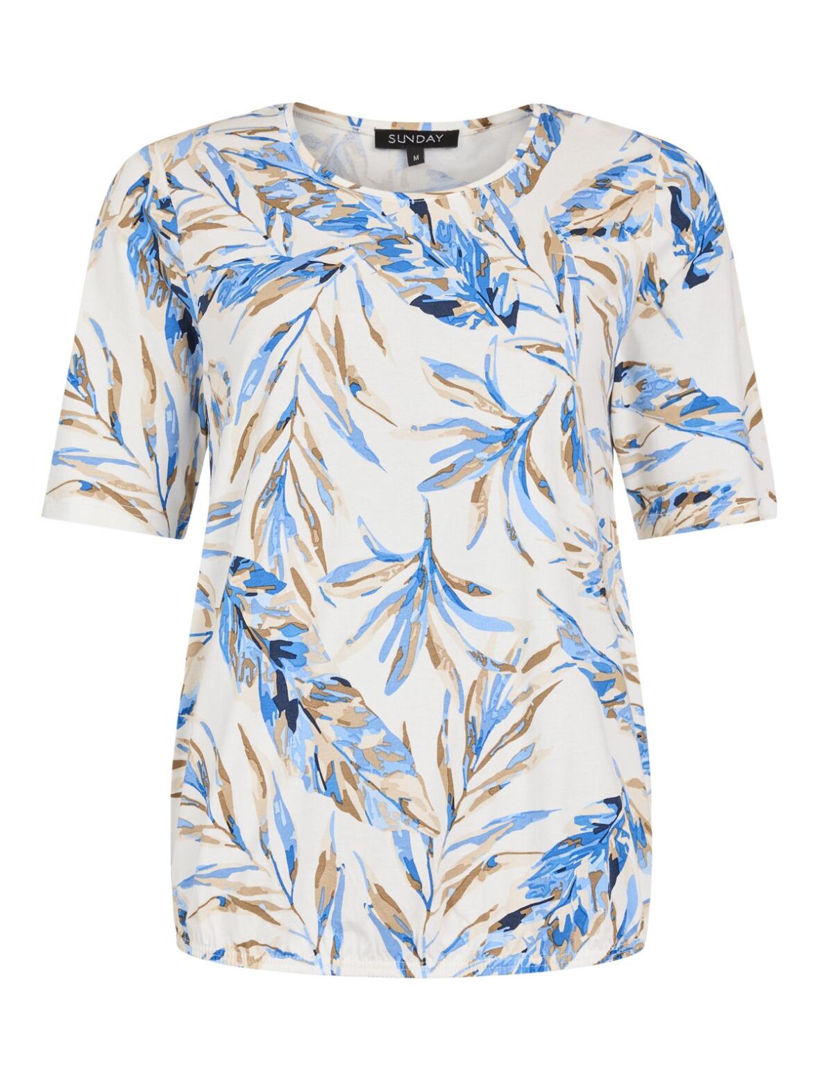Bluse fra Sunday i lyse blå. En let og feminin bluse med rund hals og korte ærmer, fint bladprint i lyseblå, blå og beige på hvid bundfarve.
