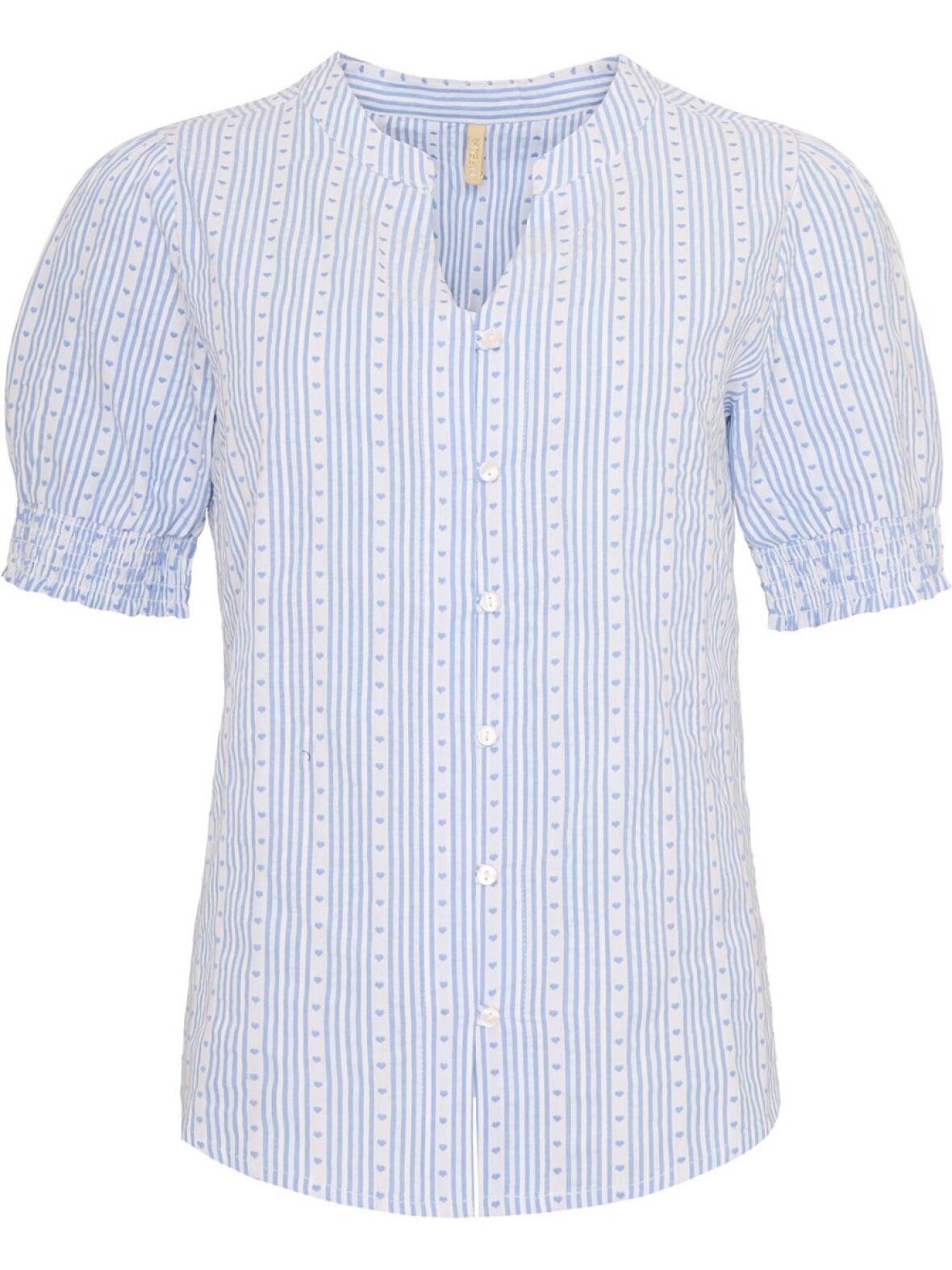 Balu skjorte/bluse fra Ofelia i lyse blå. En let og feminin model med diskret mønster i lyseblå og hvid, som byder på et sart udtryk uden at være prangende.