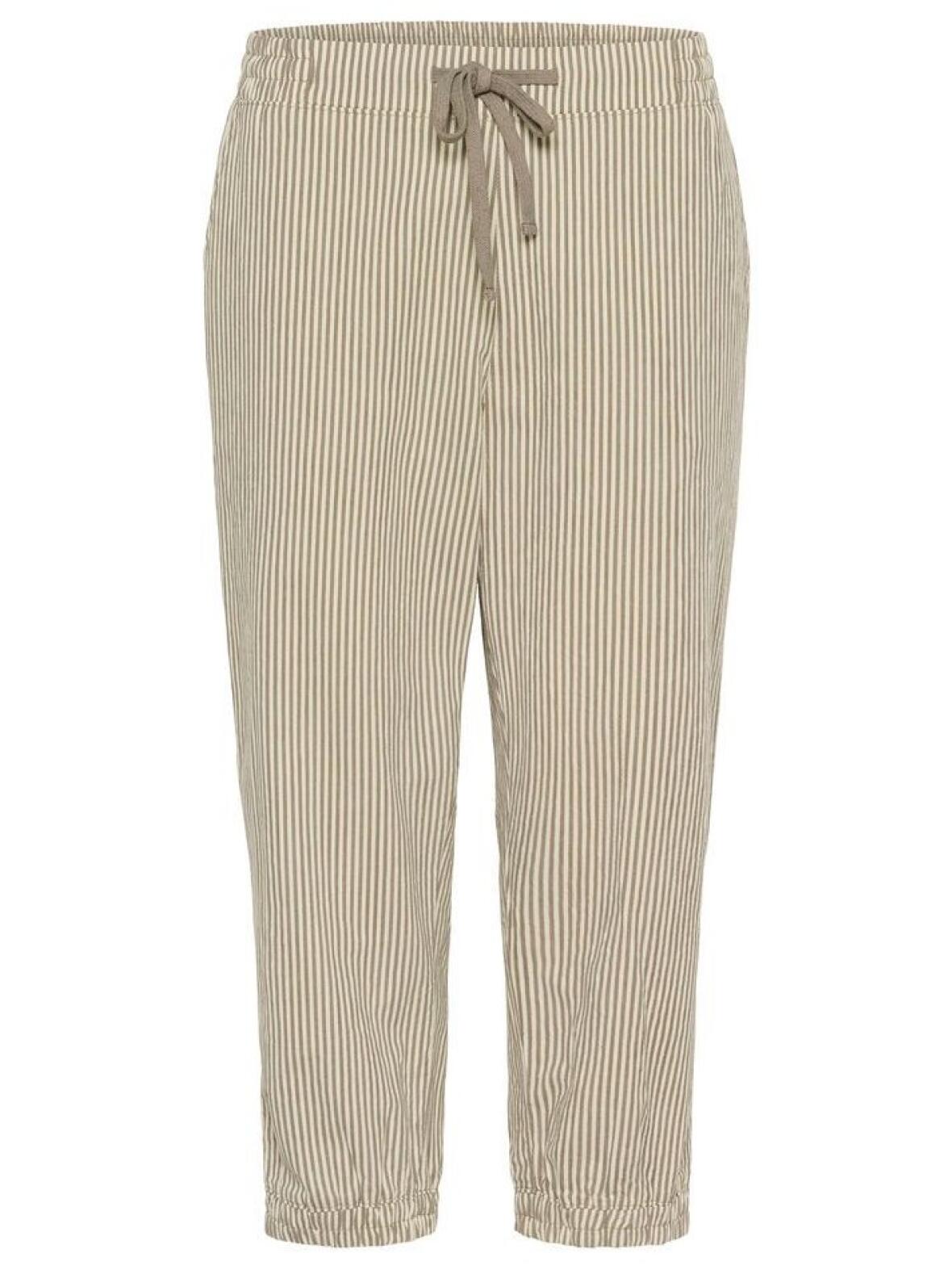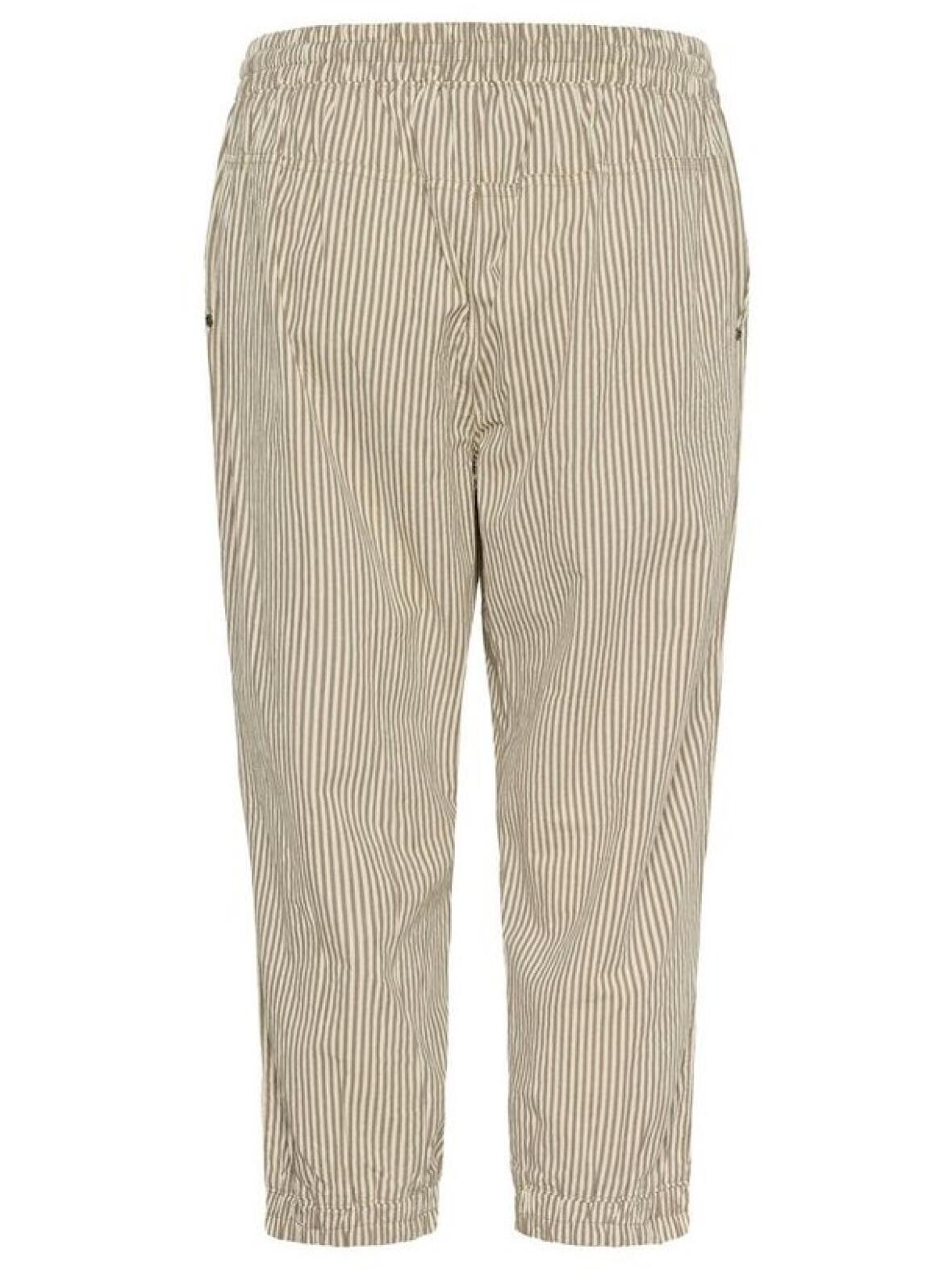 Kaffe Naya piratbuks i beige og khaki strib er blød og behagelig med et feminint, roligt udtryk. Buksen har bred elastik og bindebånd i taljen, skrålommer foran og en glat bagside, samt bred elastikkant som afslutning i benene. Fremstillet i 100 % bomuld og velegnet til hverdagsbrug med en let piratpasform og maksimal komfort. Vask ved 30 grader; max krymp 5 %.