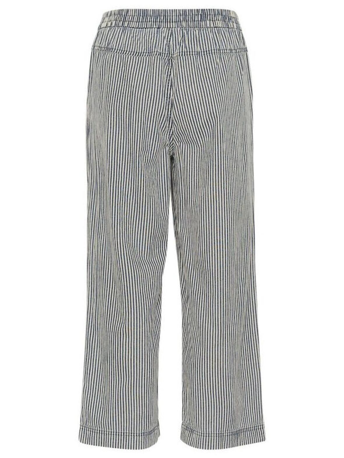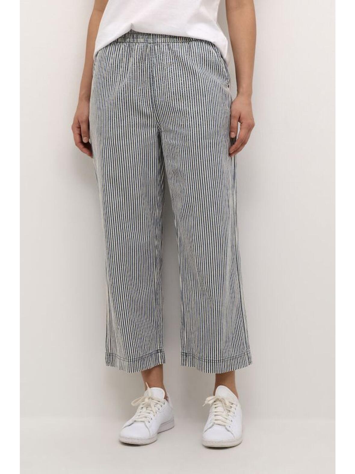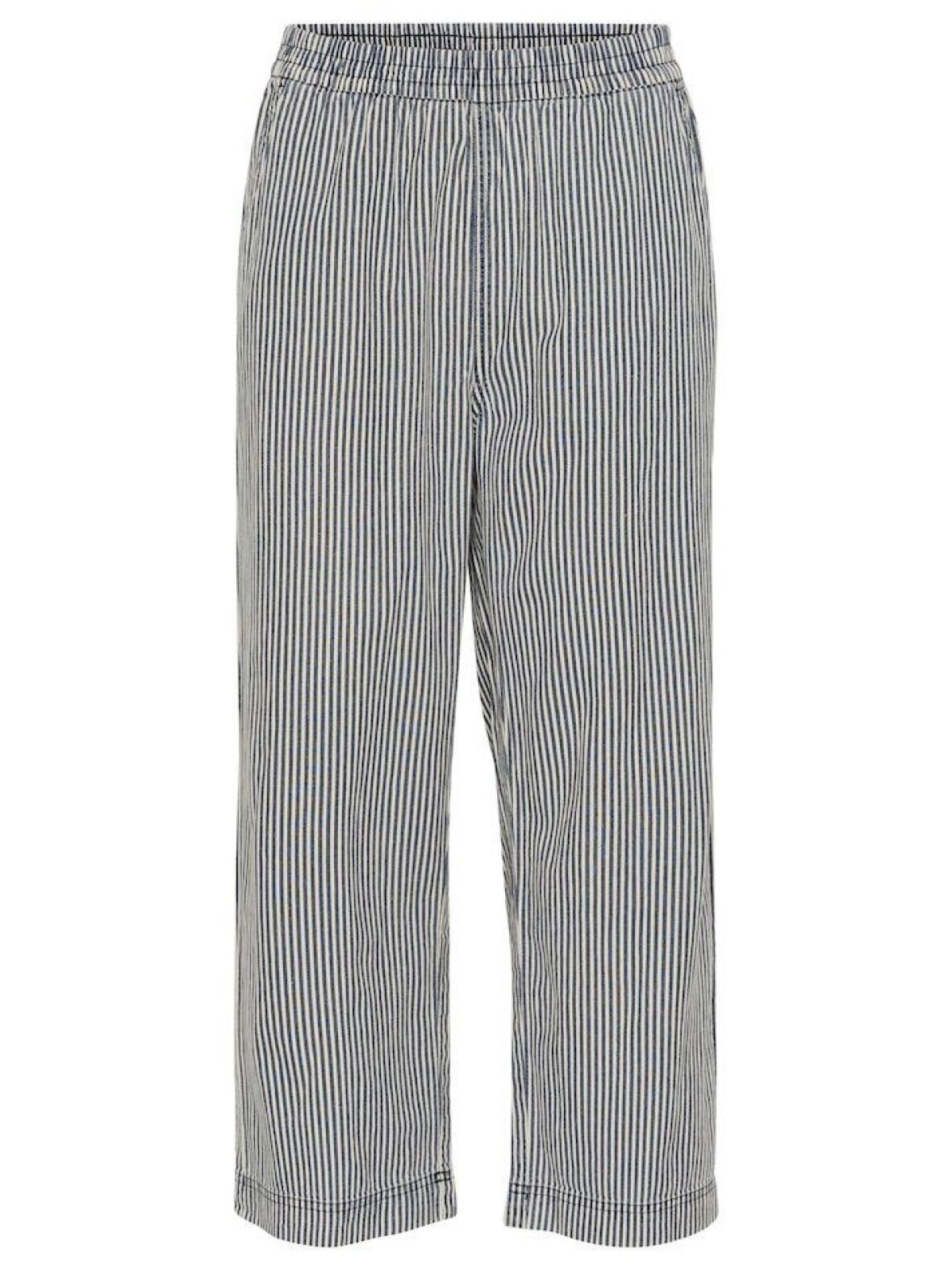 Kaffe Naya culotte bukser har bred smock-elastik i taljen, skrålommer foran og en glat bagside. Lige ben med moderat vidde skaber en afslappet men velafbalanceret pasform. Stoffet er 100 % bomuld med en sart stribet kombination i mørkeblå og beige, der giver et klassisk og afdæmpet udtryk, samtidig med at materialet føles blødt og åndbart.
