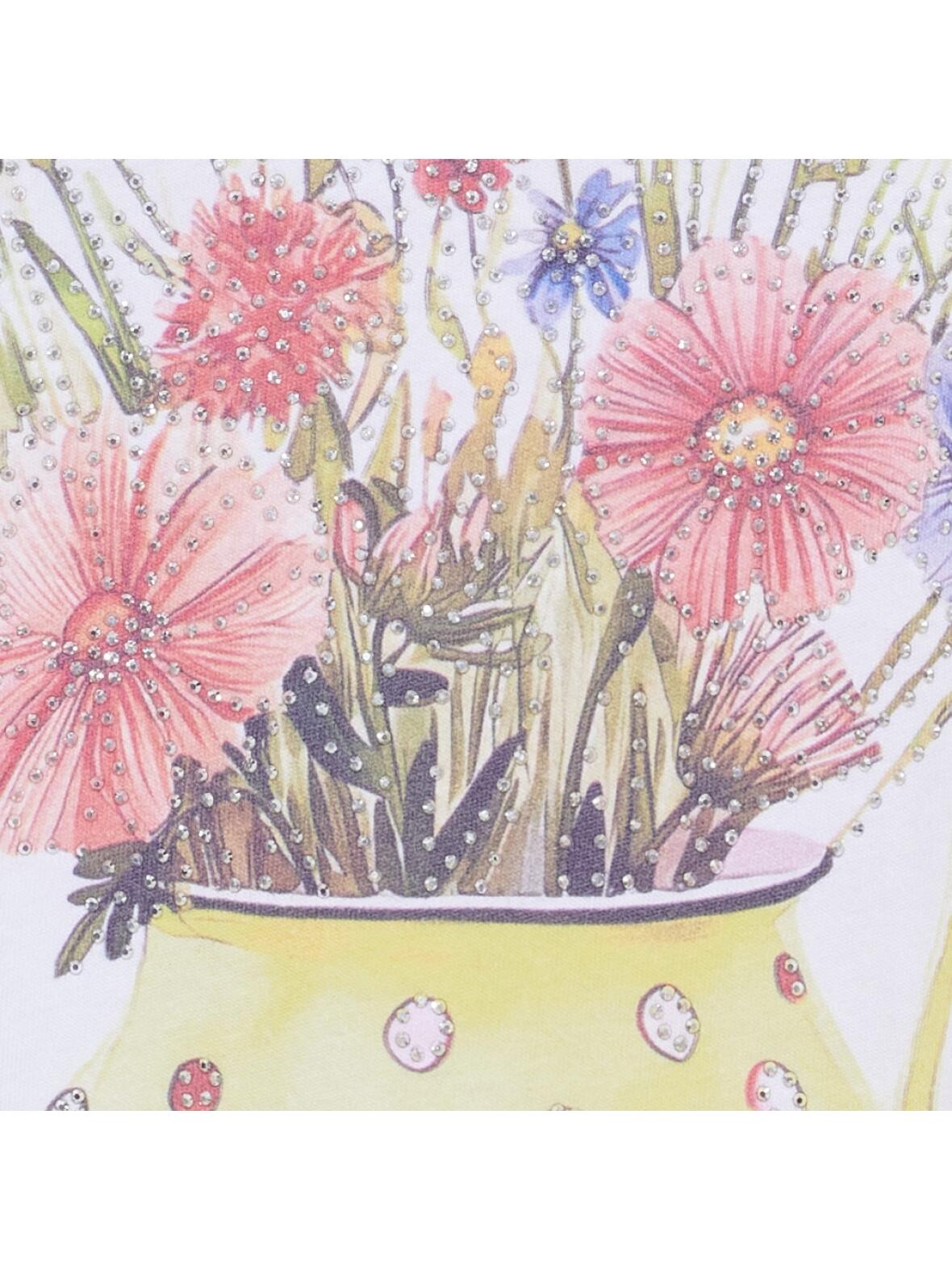 Designet er præget af en stor gul tekande med en blomsterbuket og masser af rhinsten på forstykket, hvilket tilfører et dekorativt og legende touch. Modellen er en smule længere bagpå end foran og er fremstillet i 100 % bomuld, hvilket giver en behagelig og afslappet pasform, ideel til både hverdag og let festligt brug.