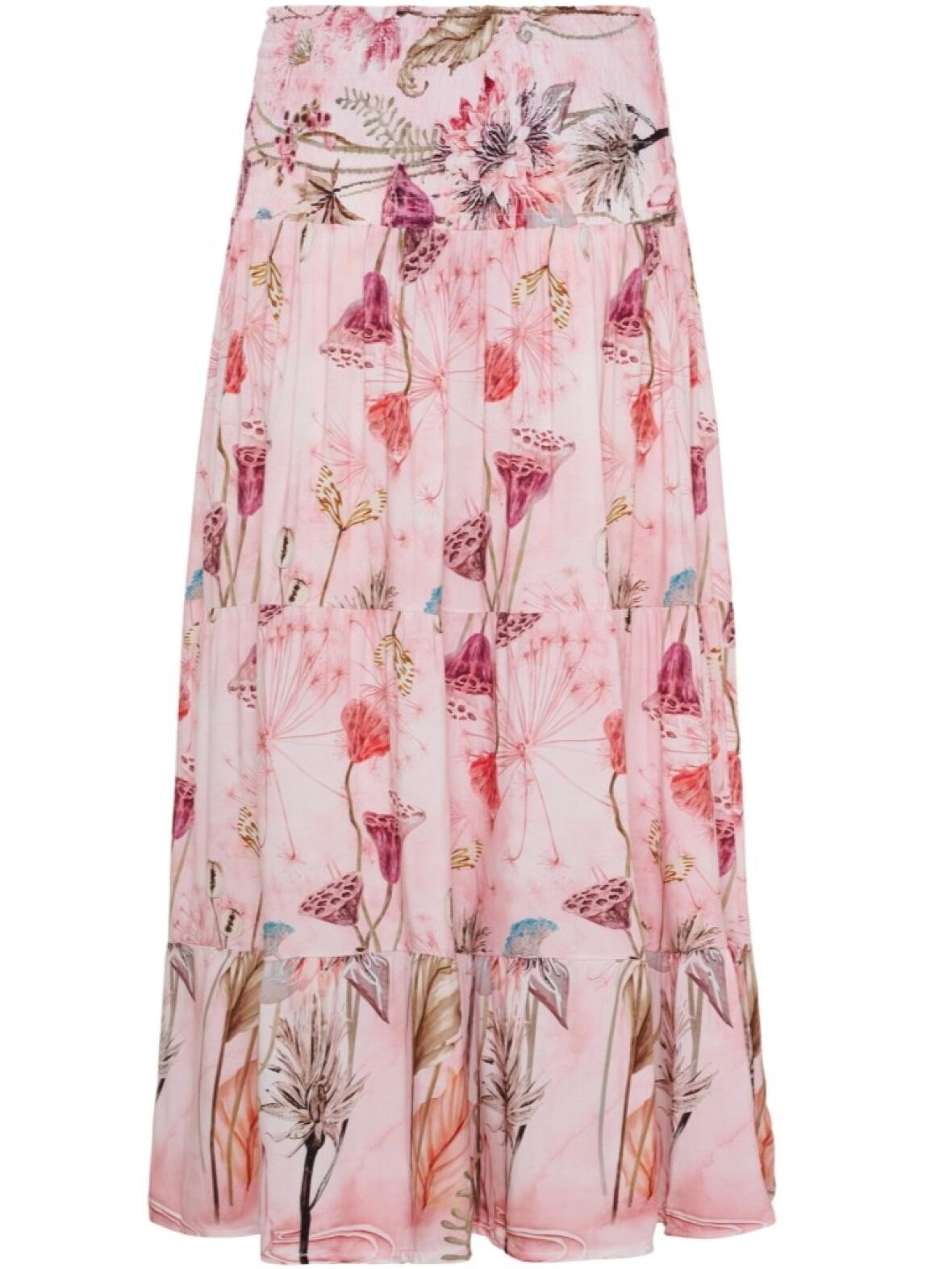 Marta Du Château Josefina nederdel har en bred smockelastik foroven og lette etageflæser, der skaber et feminint og roligt udtryk. Ankellængden falder smukt, og stoffet i 100% viscose bevæger sig let, så den også kan bruges som stropløs kjole ved særlige lejligheder. Det fine print i rosa nuancer giver en sart, elegant stemning, mens smocktoppen sikrer komfort og fleksibilitet.