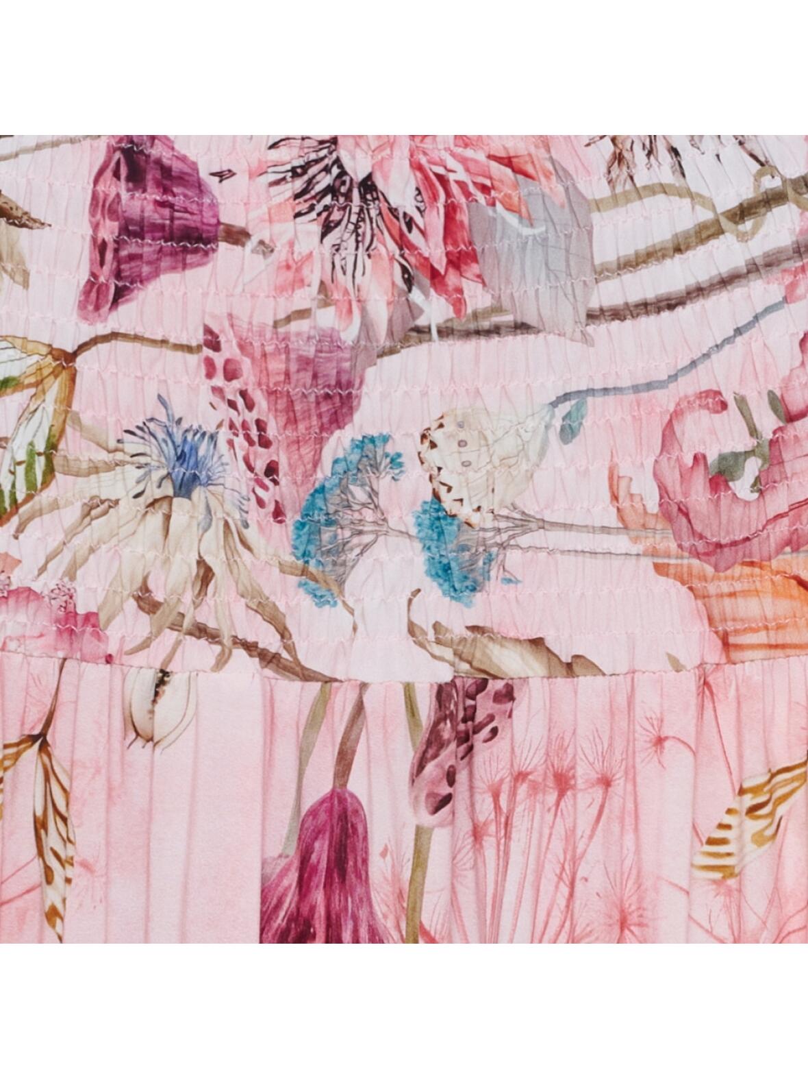 - Detaljer: Bred smockelastik foroven, etageflæser, ankellængde, kan bruges som stropløs kjole, flot print i rosa farver